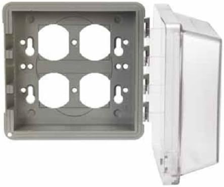 High-impact polycarbonate construction, virtually indestructible, will not rust or corrode. 2-3/4 in depth, 2-gang, pre-configured for GFCI with patented Knockout technology for alternate devices. 55-in-1 multiple combinations of duplex, GFCI, switch and rounds: 1-1/4 in, 1-3/8 in, 1-9/16 in, 1-5/8 in, 1-11/16 in, 1-3/4, 2-1/8 in, 2-1/4 in, 2-7/16 in. Clear lid. Lockable design prevents tampering and accidental disconnects. Tri-lingual instructions. Includes attached gasket and mounting hardware. 5.54 in x 5.43 in. Meets NEC requirements, UL listed. NEMA 3R Rated. Shrink wrapped.