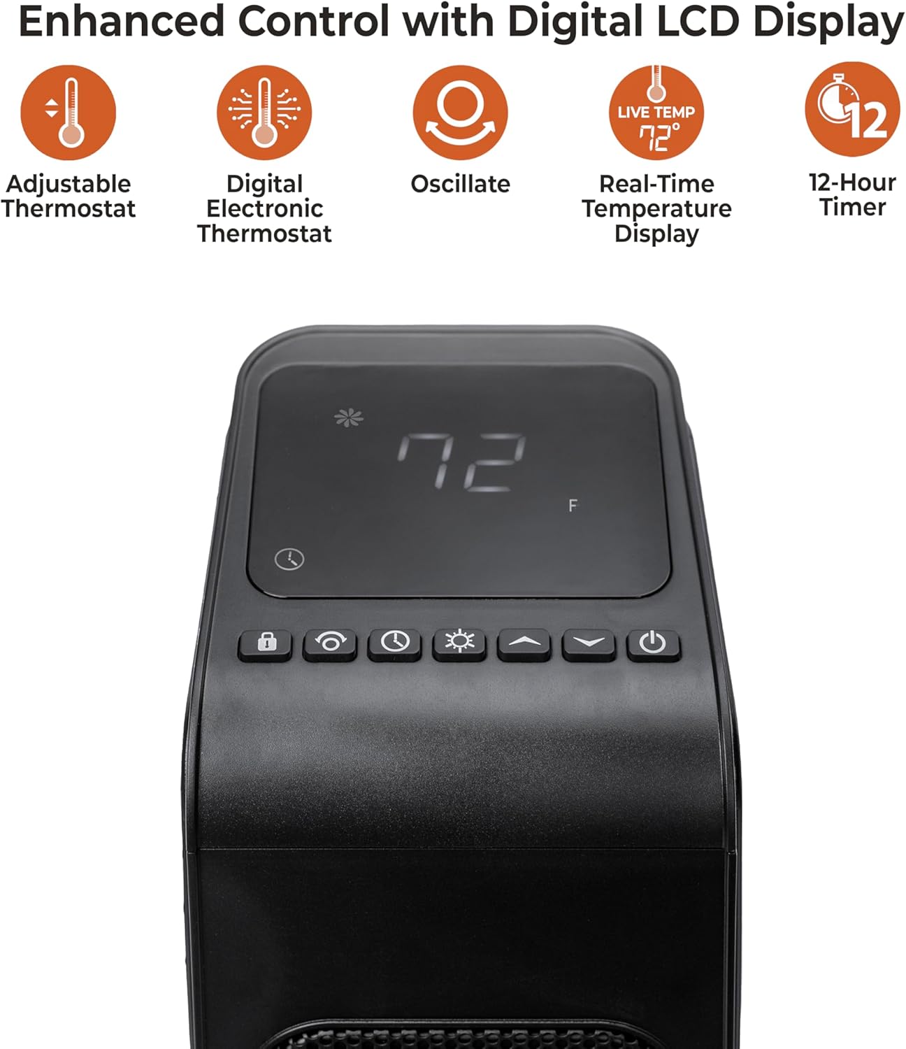 Enhanced Control with Digital LCD DisplayThis tower space heater LCD display provides real-time ambient temperature readings & enables you to set various functions. Utilize the timer function & thermostat temperature settings for personalized comfort. Navigate through different modes: fan only, eco mode, and low/high heat options displayed for easy identification. The display also allows you to toggle between Fahrenheit & Celsius. To disperse heat across your space simply engage the oscillation button on the panel or remote control.Digital Electronic ThermostatSet the temperature by pressing the arrows on the control panel or the remote control. You can set the temperature on the heater anywhere between 50°F and 90°F or between 10°C and 32°C. Once you have chosen the desired temperature, the heater will remain on until the room temperature increases to the temperature on the digital display. The heater will cycle on and off to maintain the desired room temperature. To view the ambient temperature, simply press the ambient temperature button on the control panel.Timer FunctionThis wall-mount space heater features a power off timer mode. To set the timer power mode, start the unit and press the Timer button on the control panel or remote control. Note: The timer-power-off function can only be set when the heater is in power-on mode. The digital display on the control panel changes from the set temperature readout to a time value for the timer. Press the Timer button repeatedly to change the number value between a range of to 12 hours (1-hour intervals). The Timer light turns on when the timer is set.4 Mode SettingsSelect a heat setting or fan setting by pressing the MODE button on either the control panel or the remote control to toggle between the three heat settings and fan only. The high heat mode is set to 1,500 Watts; the low heat setting is 750 Watts. ECO mode is an Economic Energy Saving Function. When ECO mode is chosen, the heater will operate to maintain a constant warm 68°F. Note: The ECO LED light will only illuminate when the ECO function is active, and the ambient room temperature falls below 68ºF / 20ºC.Enhanced Safety MeasuresThis heater is equipped with intelligent safety features to give you peace of mind. The stay-cool housing ensures the exterior remains cool to the touch, minimizing the risk of accidental burns. The tip-over cutoff switch automatically shuts off the heater if it is accidentally knocked over, and the overheat protection system adds an extra layer of safety by automatically turning off the heater if it reaches an unsafe temperature. The heater comes with a stand for a freestanding option.