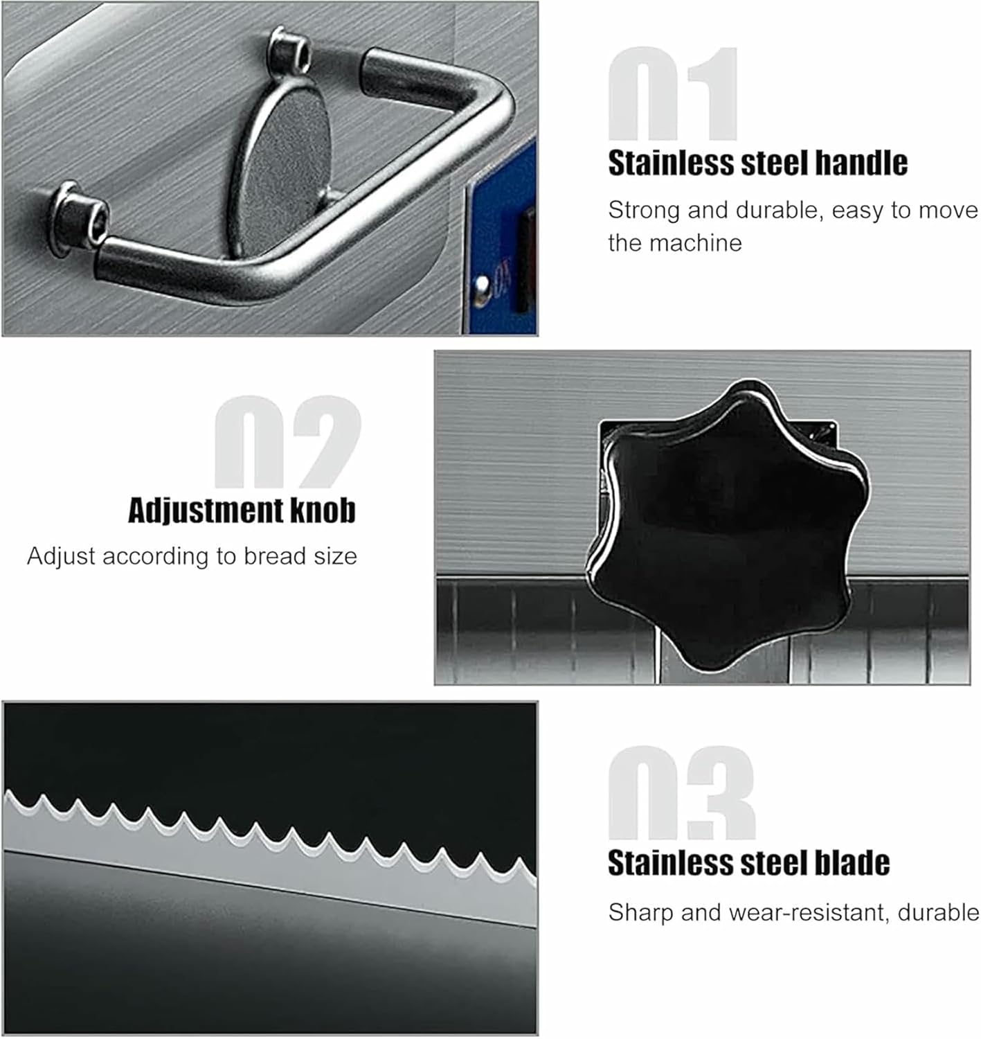 Upgrade your bakery, milk tea shop, processing plant, or coffee shop with our efficient commercial bread slicer. This stainless steel slicer can easily slice bread into 31 pieces at once, saving you time and space in the kitchen. Say goodbye to tedious slicing and hello to seamless bread preparation with this top-of-the-line equipment.Specifications:Material: 304 Stainless SteelVoltage: Power: 370WSlice Thickness: 0.47 inch/12 mmSlice Number: 31 PiecesWidth Of The Bread: 4.3-15.0 inch/110-380 mmProduct Size: 68*56*66cmNet weight: 40kg/88.2lbsPacking size: 69*69*59cm/27.2*27.2*23.23inGross weight: 50kg/110lbsPackage Content:1 x Commercial Toast Bread Slicer