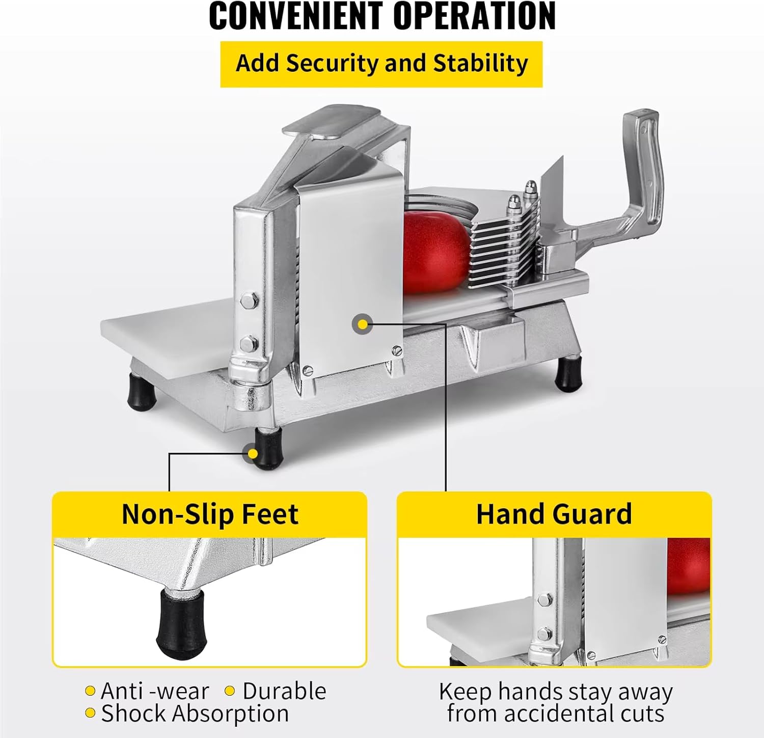 Specifications Slice Size: 1/4" Thick Blade Material: Stainless Steel Blade Type: Angled Product Weight: 9.5 lbs / 4.3 kg Product Dimensions: 19.2" x 7.3" x 8.8" / 488 x 185 x 224 mm Package Content 1 x Tomato Slicer 1 x User Manual Rated voltage (appliances or chargers): AC110-240/50HZ;