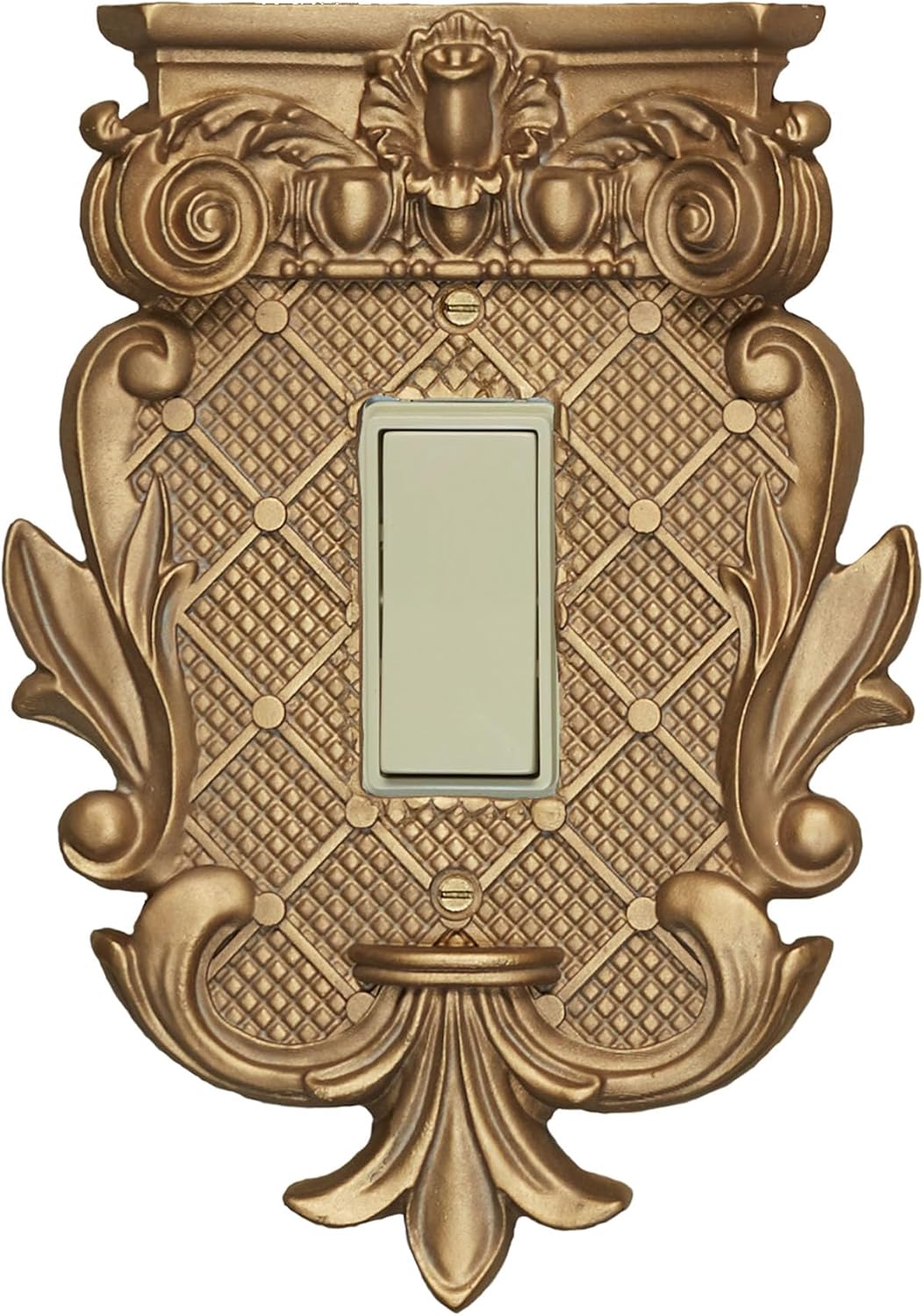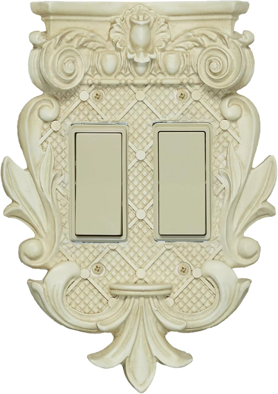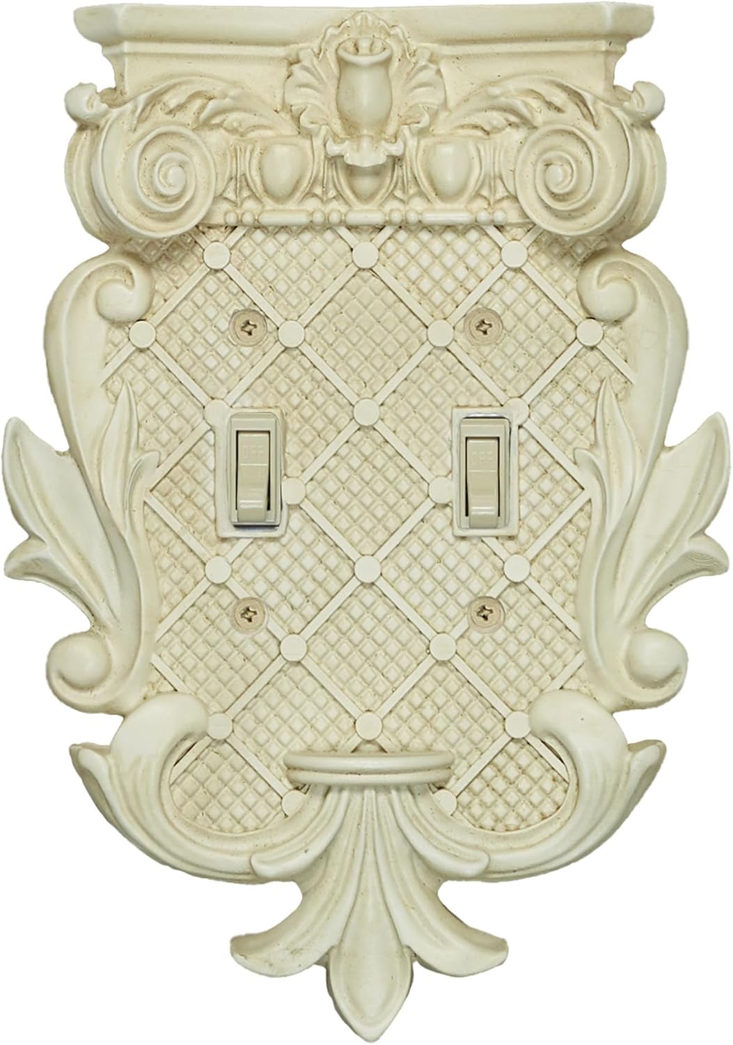 A Corinthian Switchplate graces a space with classic architectural details. The resin design features elegant latticework, fleur-de-lis, flourishing acanthus leaves, and a column-inspired flat-topped design with scrolling volutes and timeless egg and dart motifs. For a classic touch, the antique ivory finish adds a timeless, vintage flair. The dimensional wall plate adds a unique decorative element to your decor full of rich texture for a luxury style finishing touch that stands out. Color-matching paint-tipped screws are included; do not over-tighten screws. The single switch design measures 5.25"Wx1"Dx7.5"H.