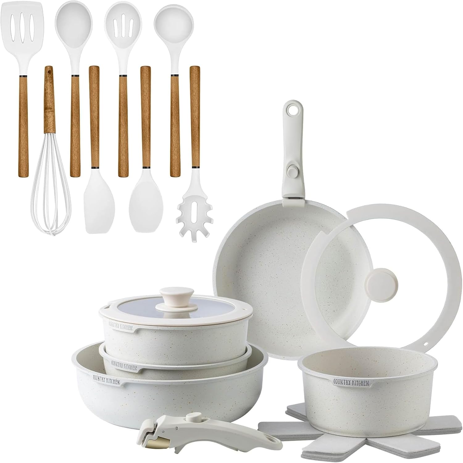 At Country Kitchen, You'll find quality cookware and utensils that add charm and class to your cozy kitchen. This set includes 5 pots, two handles, two pot lids and 4 pot protectors as well as 8 essential silicone cooking utensils with strong wooden handles