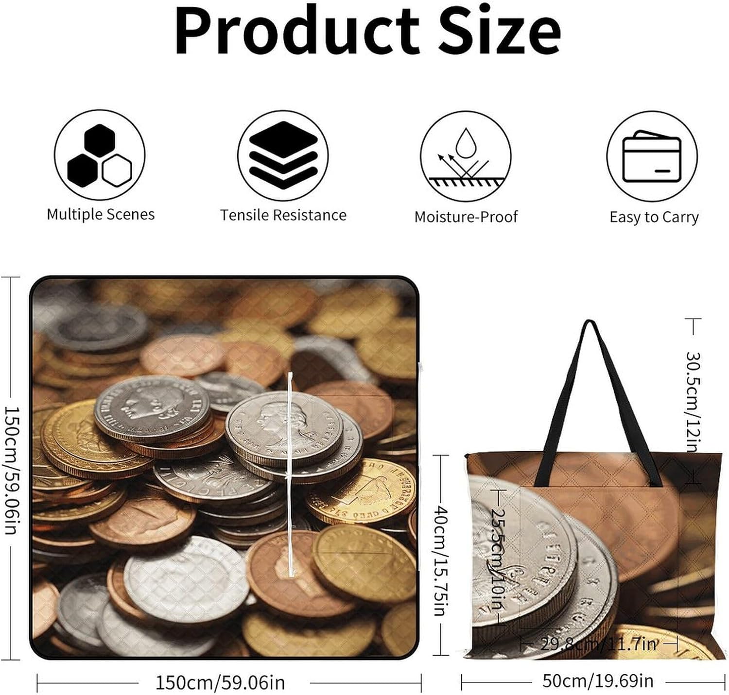 The picnic blanket ,we've only used the highest quality materials, so every picnic is an experience .The underside lining is very sturdy and therefore suitable for every surface. No more worrying about dirty or wet bottoms when you are sitting on damp grass. The Currency Coin blanket protects you from water, dust and dirt.A large capacity bag and a picnic blanket, 2in1. It has a large capacity and one bag can hold everything you need for going out. You choose the place you want to lie down, and this bag can be turned into a comfortable picnic blanket in seconds also it can fold into tote bag, which is waterproof, sand-proof and wear-resistant.Therefor,you can take it to nearby parks, campuses, beaches or lawn, anywhere you want to lie down.