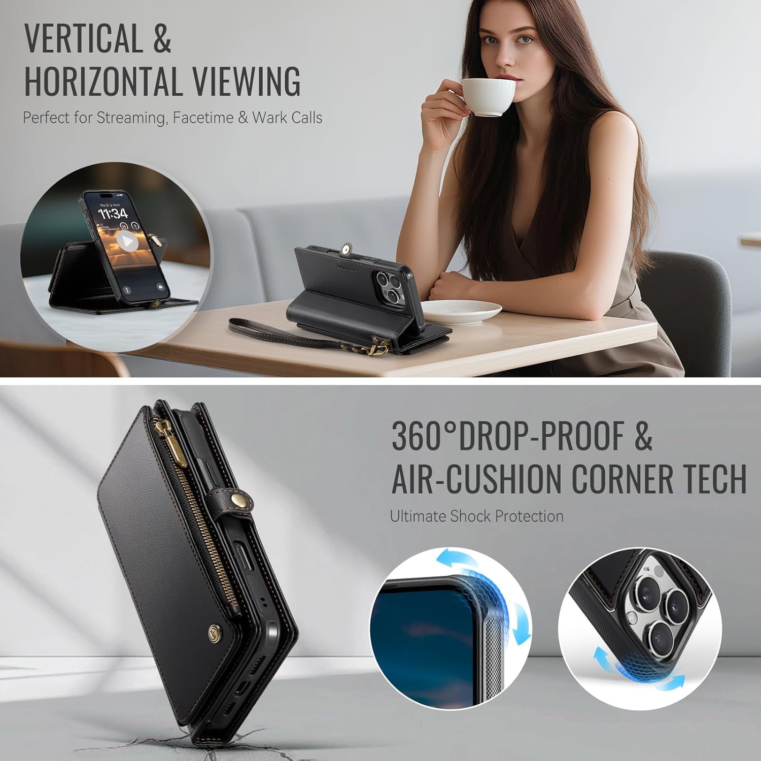 | Additional Features | Compatible with MagSafe, Magnetic, Stand Function, Wrist Strap, Zipper Wallet with RFID Blocking 9-Card Holder |