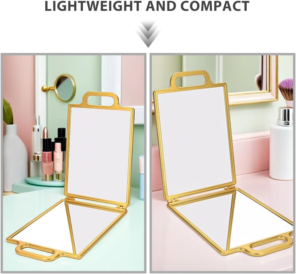 Description This sturdy folding double-sided mirror is designed for professional hairdressing and personal grooming. Its sleek gold finish adds a touch of elegance, making for salons or home use. The portable design allows users to easily check the back of their head, ensuring precise styling results. Features -Color:Golden -Material:Glass; Plastic -Size:36.70X24.00X2.50cm/14.42X9.43X0.98in -Dual sided folding design: the mirror features a dual sided folding design, allowing you to easily view the back of your head, making it ideal for professional hairdressing needs -Elegant gold finish: the high end gold exterior enhances the sophistication of any salon, adding a touch of luxury and elevating the overall aesthetic -Portable and travel friendly: designed with portability in mind, this mirror is lightweight and compact, fit for on the go services or travel use -Precision mirror surface: crafted with sturdy mirror technology, it delivers color reflection, ensuring accurate hairstyling results -Handsfree stand design: the freestanding design allows for handsfree use, making it convenient for personal home styling and effortless self grooming