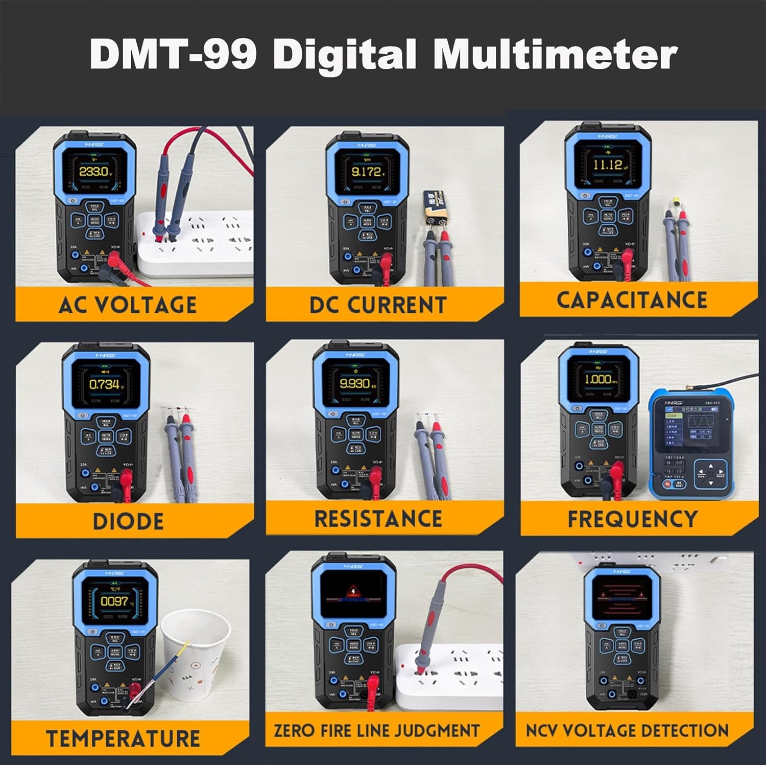 SPECIFICATIONDC Voltage: 9.999V-999.9V, accuracy: ±(0.5%+3)AC voltage: 9.999V-750.0V, accuracy: ±(1%+3)DC current: 9999μA-9.999A, accuracy: ±(1.2%+3)AC current: 9999μA-9.999A, accuracy: ±(1.5%+3)Resistance: 999.9Ω-999.9Ω, accuracy: ±(0.5%+3); 99.99MΩ, accuracy: ±(1.5%+3)Capacitance: 999.9μF/99.99μF/9.999μF/999.9nF/99.99nF/9.999nF, accuracy: ±(2.0%+5); 9.999mF-99.99mF, accuracy: ±(5.0%+20)Frequency: 9.999MHz-9.999Hz, accuracy: ±(0.1%+2)Temperature: -55℃-1300℃, -67℉-2372℉, accuracy: ±(2.5%+5)Diode: YesContinuity test: YesLive Wire: YesNCV: YesPower supply: 1500mAh lithium batteryWorking conditions: 0-40℃, <75%RHStorage conditions: -20~60℃, <80%RHWeight: 0.41 lb.PACKAGE1 x Digital Multimeter1 x Test Pen1 x Charging Cable