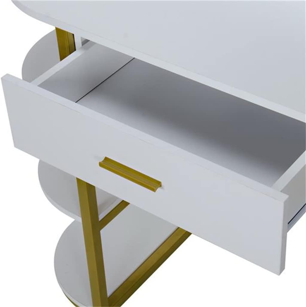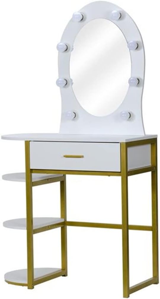 P2 MDF metal e structure dresser, take off the mirror, can also be used as a writing book and desk This is a simple yet stylish dresser with a white countertop and gold steel e design that adds richness to the dresser. The oversized Hollywood Alien Vanity Mirror with 8 bulbs completes your makeup experience. The table has a large drawer and three shelves for various cosmetics, toiletries, books and sundries. Widely used in bedrooms, closets, living rooms and entryways Material: MDF and solid wood Dimensions: (31.5x15.75x30.90-57.88)" / (80x40x78.5-147)cm(L x W x H) Mirror size: (27.56x19.69)"/(70x50)cm Drawer size: (16.93x13.19x3.15)"/(43x33.5x8)cm Weight: 49.16lb/22, 3kg Package: 1 x Dresser 1 * Description (Other demo items not included). Notice: 1. Due to manual measurement, please allow 2-3% error, before you bid, please make sure you don't mind. 2. The color may vary due to different displays, please refer to the actual product. The sleek look blends into any decorating style and adds a touch of
