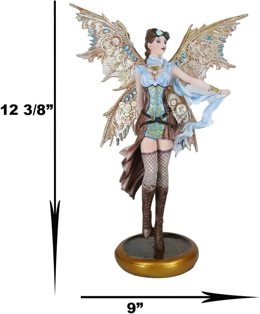 This Steampunk Aviator Fairy sculpture stands 13" tall, 9" long and 4.5" deep approximately. This Steampunk Aviator Fairy sculpture is made of designer composite resin, hand painted and polished. She will be a wonderful decoration for your home and gift for a loved one! This traveler steampunk fairy stands on the time warp machine as she readies herself for a time travel. She has a mission to accomplish that is to go back in time and assassinate an individual that will be an evil conqueror in the future time. She is a gorgeous fairy to behold!