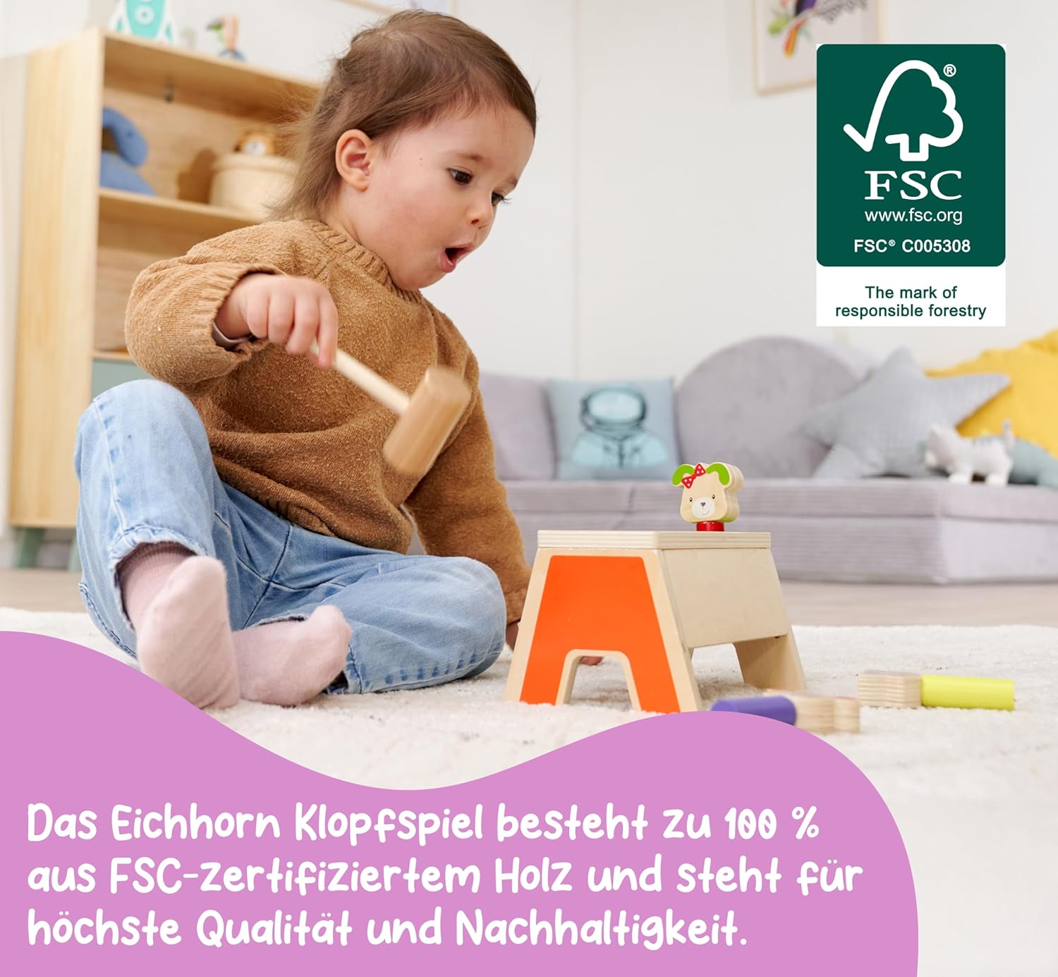 Discover the cheerful knocking game from Eichhorn from the Friends line - the perfect toy for little explorers from 1 year With the three colourful playing surfaces and a wooden hammer, this game brings hours of fun while promoting your child's fine motor skills and hand-eye coordination. As soon as one of the three figures is knocked down, it pops up in a flash and flies out - a fun surprise effect that always provides enthusiasm! After knocking down, your child can easily match the figures to the matching colours, plug in and start again. The Eichhorn knocking game is made from 100% FSC-certified wood and stands for the highest quality and sustainability. Let your child experience the world of knocking and discovering - with the Friends knocking game from Eichhorn!