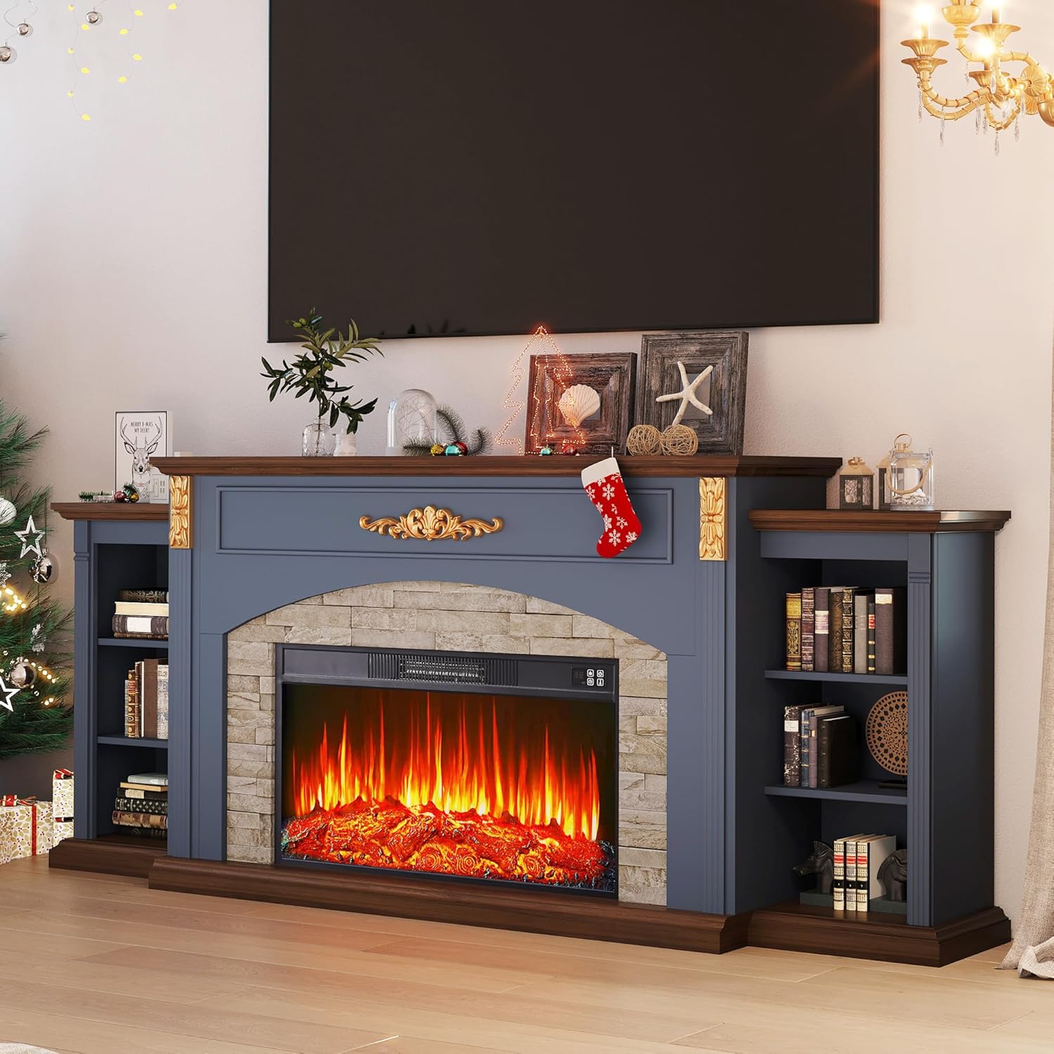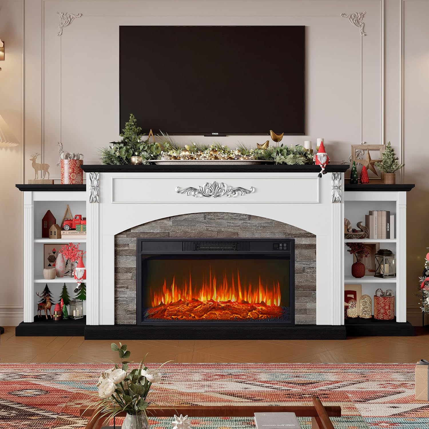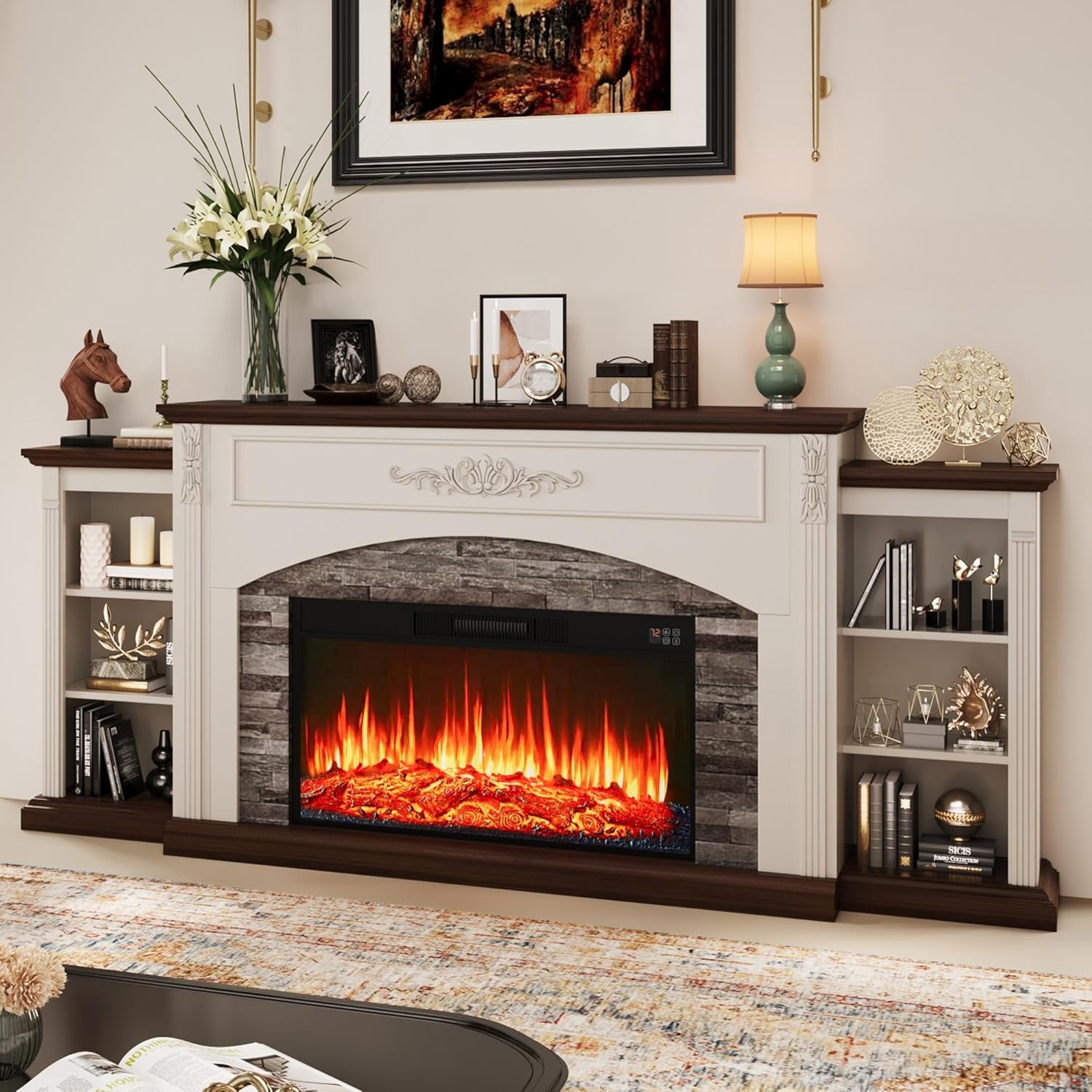 | Included Components | Mantel, 23'' Fireplace Insert, Adjustable Shelves, Natural Wood Grain Tabletop, Thicker, More Stable Base, Side Columns with Carved Deco |