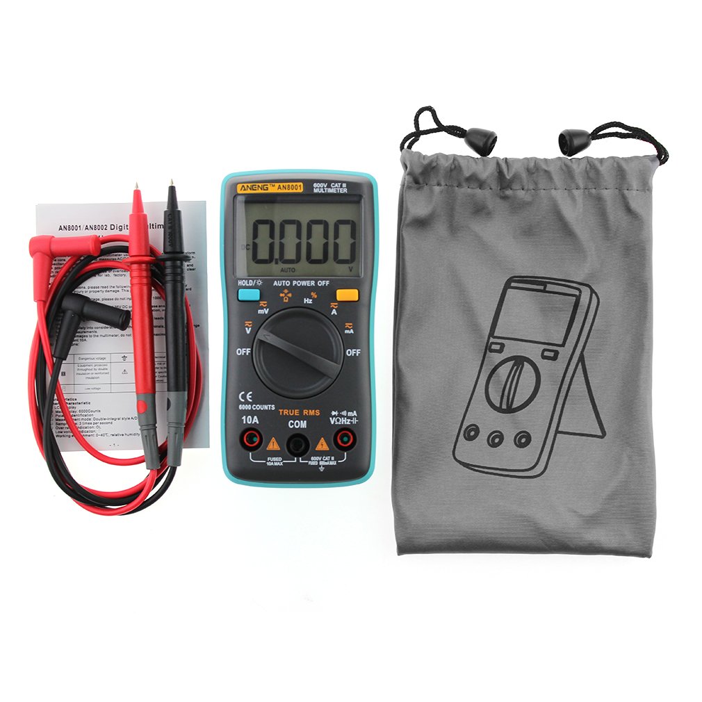 Descriptions: It is a Auto-ranging digital multimeter using double-integral style AC/DC transform as the core. The products are battery powered. An ideal tools for factory, radio fans and family use. Specifications: Frequency: 5/50/500/5k/50k/500k/5M/10M (+ 0.1+3) Capacitance: 10nF (+ 5.0+20), 100nF/1uF/10uF/100uF (+ 2.0%+5), 1000uF/10000uF (+ 5.0%+5) () DC voltage: 600mV (+ 1.0%+10), 6V/60V/600V/1000V (+ 0.5%+3) AC voltage: 600mV (+ 3.0%+3), 6V/60V/600V/750V (+ 1.0%+3) DC current 600uA/6000uA (+ 1.5%+3), 60mA/600mA (+ 1.5%+3), 10A (+ 1.5%+3) AC current 600uA/6000uA (+ 1.5%+3), 60mA/600mA (+ 1.5%+3), 10A (+ 1.5%+3) Resistance: 600 (+ 0.5%+3), 6K/60K/600K/6M (+ 0.5%+2), 60M (+ 1.5%+3) Measurement methods: double integral A/D converter Share ratio: 1% to 99% (+ 1%) Ultra range display: OL Working environment: 0~40 C, relative humidity <80% Power supply voltage: 3V (AAA x2 Pcs 1.5V) (not included) Color: Blue & gray Size: 130*65*30mm Package size: 140*80*40mm Package included: 1 x Multimeter Device 1 x Pair Of Electronic Probe 1 x User Manual 1 x Storage Bag
