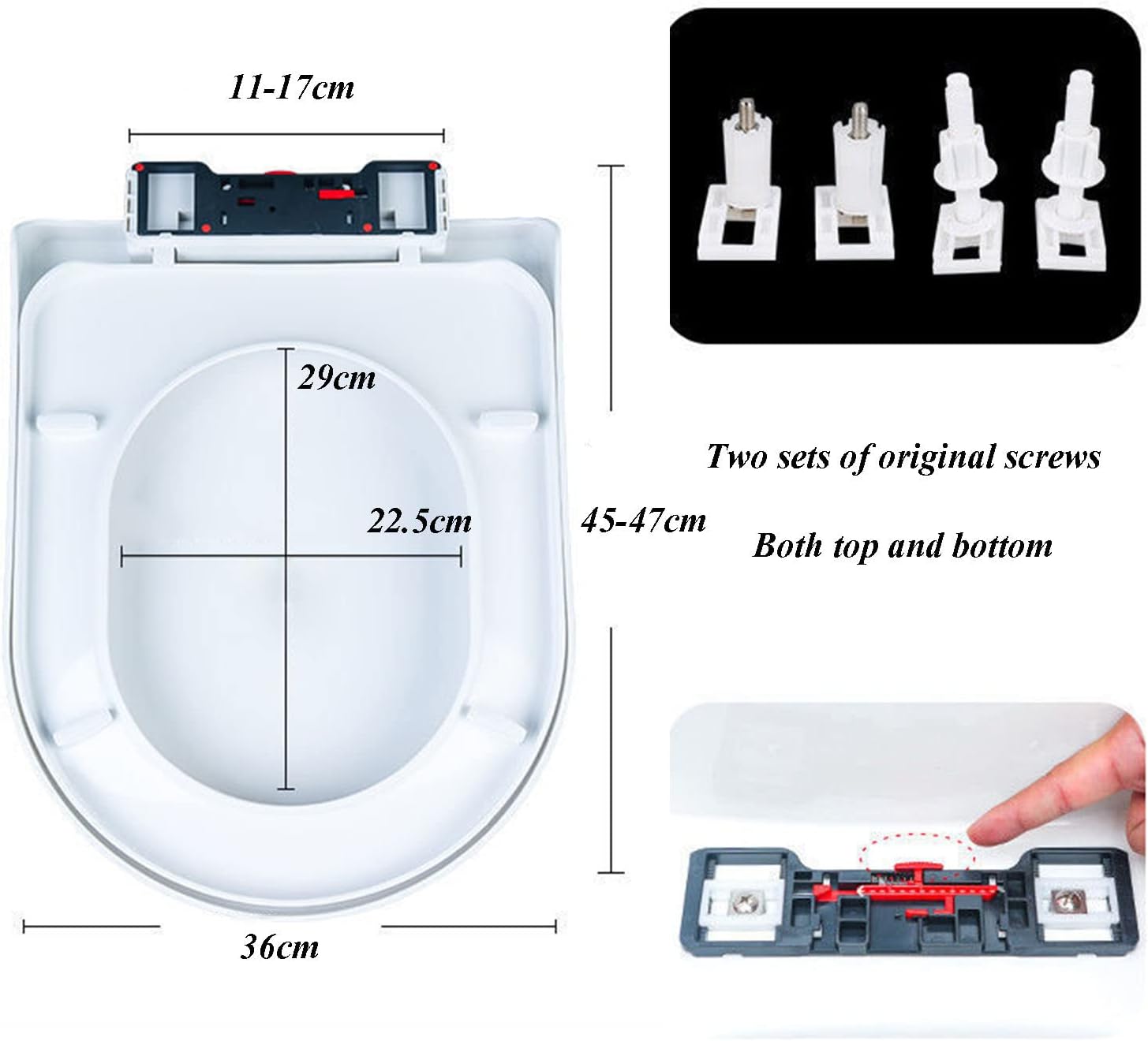Thoughtful Design: This round toilet lid is ergonomically designed to enhance the comfort of the seat. It fit the most standard Round toilet. Please confirm the shape and size before purchasing. No Slam: The toilet cover can be slow down and silent when closing, the closing speed is very slow and quiet, it won't wake up your family at night. And it doesn't pinch and protects the ceramic toilet bowl. Easy to Clean: Toilet seat is made of high-quality thick polypropylene plastic, which is resistant to stains, chips, scratches, cracks on the surface, it's easier to clean than ordinary plastic. Easy Installation: The toilet cover is easy to install, it only takes a few minutes to complete the installation, and the product is light weight and can be installed by yourself, easy to disassemble and wash. Quick Release Function: This soft close toilet seat is the top fixing,only need one screw driver to release it. so you can clean toilet bowl easily Toilet Seats Screws: The Toilet Seat Screws are made with steel and premium plastic material for long time usage, no slippage, no rusting, and excellent tightly fit. Big Toilet Ring: The toilet seat Ring is bigger enough to suit to the different weight people.