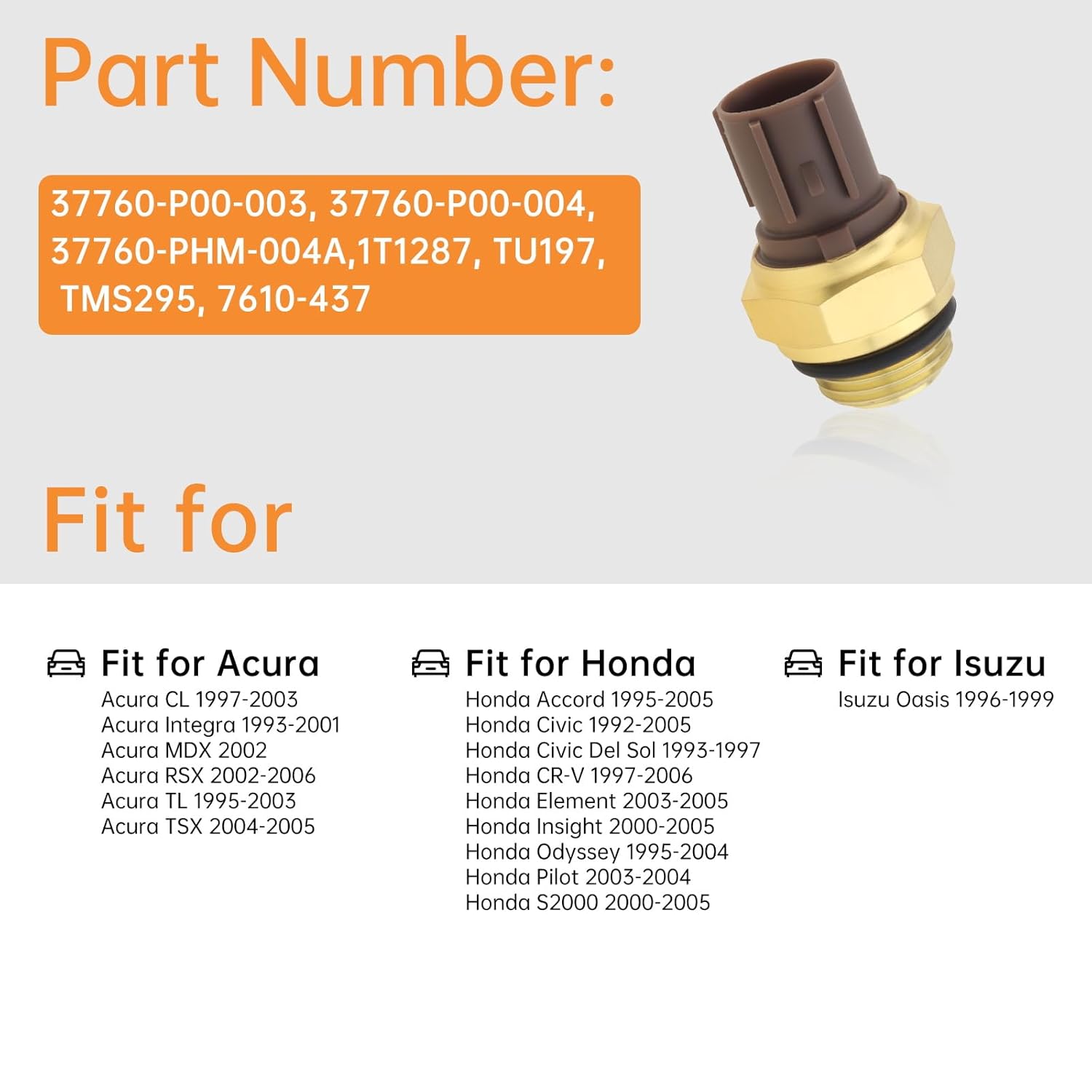 Parameter Information: Manufacturer Part Number: 37760-P00-003 / 37760-P00-004 / 37760-PHM-004A Interchange Part Number: 1T1287, TU197, TMS295, 7610-437 Product Description: Product Name: Plug-and-Play Coolant Water Temperature SensorFeatures: - Function Introduction: This Coolant Temperature Switch is a vital engine protection device. It automatically activates your cooling fan or warning light when coolant reaches a critical temperature. Ensure optimal engine operating temperature and avoid overheating with this reliable, direct-fit replacement switch. - OE Reference & Fitment: The sensor carries OE numbers 37760-P00-003, 37760-P00-004, and 37760-PHM-004A. For detailed vehicle compatibility, refer to product images and listing details. Always confirm fitment before purchase. - Robust & Heat-Resistant: Crafted from premium metal, rugged plastic, and advanced circuit boards, this sensor withstands extreme engine conditions, including high temperatures, vibrations, and dust exposure. Maintains stable performance under harsh environments, preventing premature failure and ensuring consistent engine operation. - Easy Replacement: Designed for direct plug-and-play replacement of faulty sensors, this coolant temperature sensor simplifies maintenance. For safety, always disconnect the battery and allow the engine to cool before installation. Professional assistance is recommended to ensure proper sealing and prevent coolant leaks. After installation, verify sensor functionality using diagnostic tools and check for leaks. - Precision & Reliability: Delivers real-time, accurate temperature data converted into stable electrical signals for Engine Control Unit processing. Each unit undergoes rigorous functional testing and visual inspections to meet exacting standards. The high-sensitivity thermistor ensures rapid response to temperature changes, optimizing engine efficiency and preventing overheating-related damage. - Material: Plastic/Metal - Pin Counts: 2-pins - Operating Voltage: 12 V - Connector Type: Plug In - Measurement Accuracy: ±1.5% - Operation Mode: ON-OFF - Contact Type: Normally ClosedPlace of Application: - Fit for Acura CL 1997-2003 - Fit for Acura Integra 1993-2001 - Fit for Acura MDX 2002 - Fit for Acura RSX 2002-2006 - Fit for Acura TL 1995-2003 - Fit for Acura TSX 2004-2005 - Fit for Honda Accord 1995-2005 - Fit for Honda Civic 1992-2005 - Fit for Honda Civic Del Sol 1993-1997 - Fit for Honda CR-V 1997-2006 - Fit for Honda Element 2003-2005 - Fit for Honda Insight 2000-2005 - Fit for Honda Odyssey 1995-2004 - Fit for Honda Pilot 2003-2004 - Fit for Honda S2000 2000-2005 - Fit for Isuzu Oasis 1996-1999Note: - We provide clear pictures and measurement wherever possible. Please verify that the product is what you need. - Professional installation is highly recommended. - Compatibility information is for reference only. Please ensure the item fits your car before purchase.Package Include: 1 x Coolant Temperature Sensor