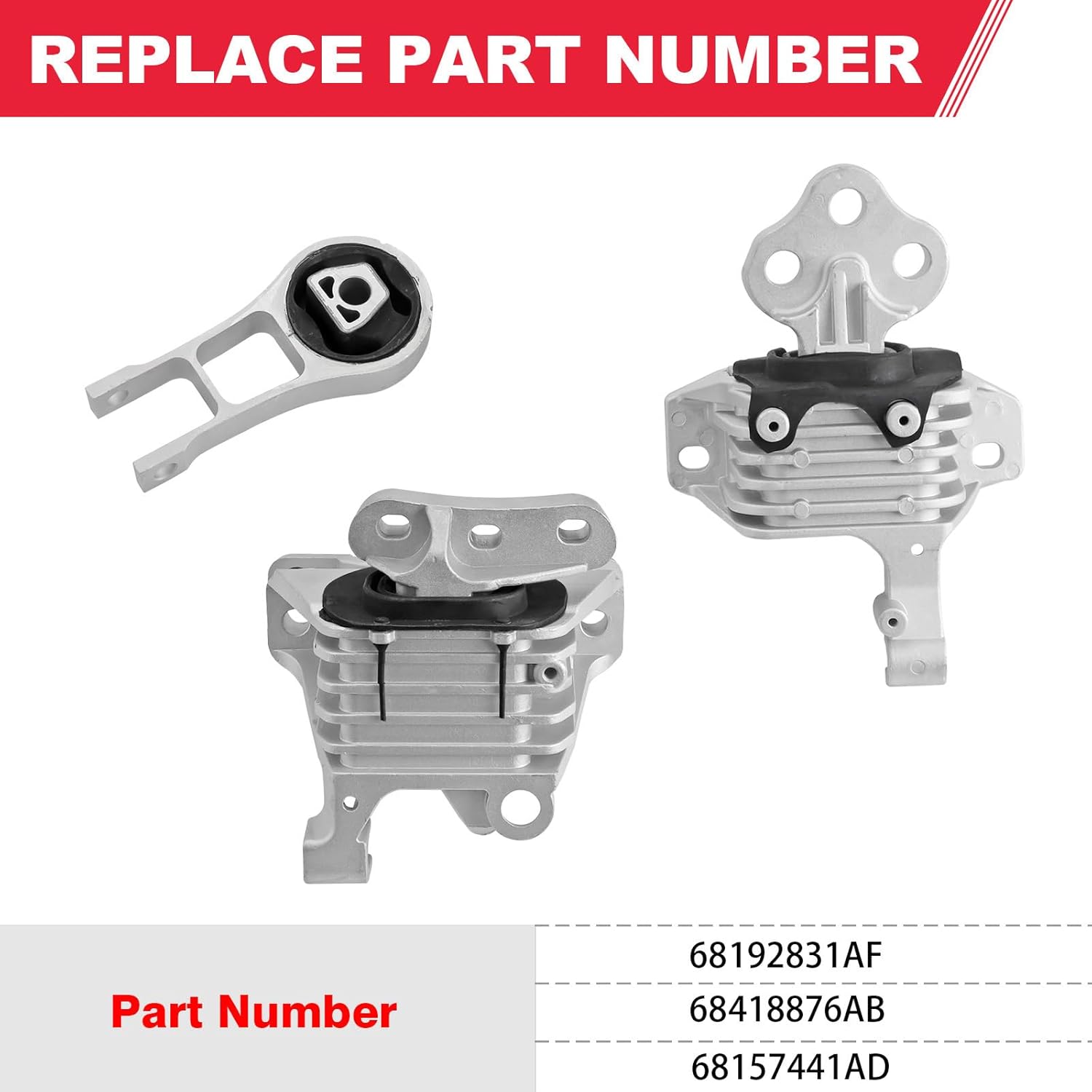 Advantage: Tested & Certified to Meet or Exceed OEM Quality Standards. 100% Tested Before Leaving the Factory. Made of High Quality Material. Replace Part Number: 68192831AF, 68418876AB, 68157441AD Compatible: 2014-2021 Jeep Cherokee 2.4L 2015-2017 Chrysler 200 2.4L Includes: 1 X 3378 - Front Right Engine Mount 1 X 3308 - Rear Engine Torque Strut Mount 1 X 3380 - Transmission Mount Warranty: The Engine Motor and Transmission Bracket Kit come with 12 Months Warranty. Hassle-Free Return and Refund Policy. Please Buy it with Your Confidence.