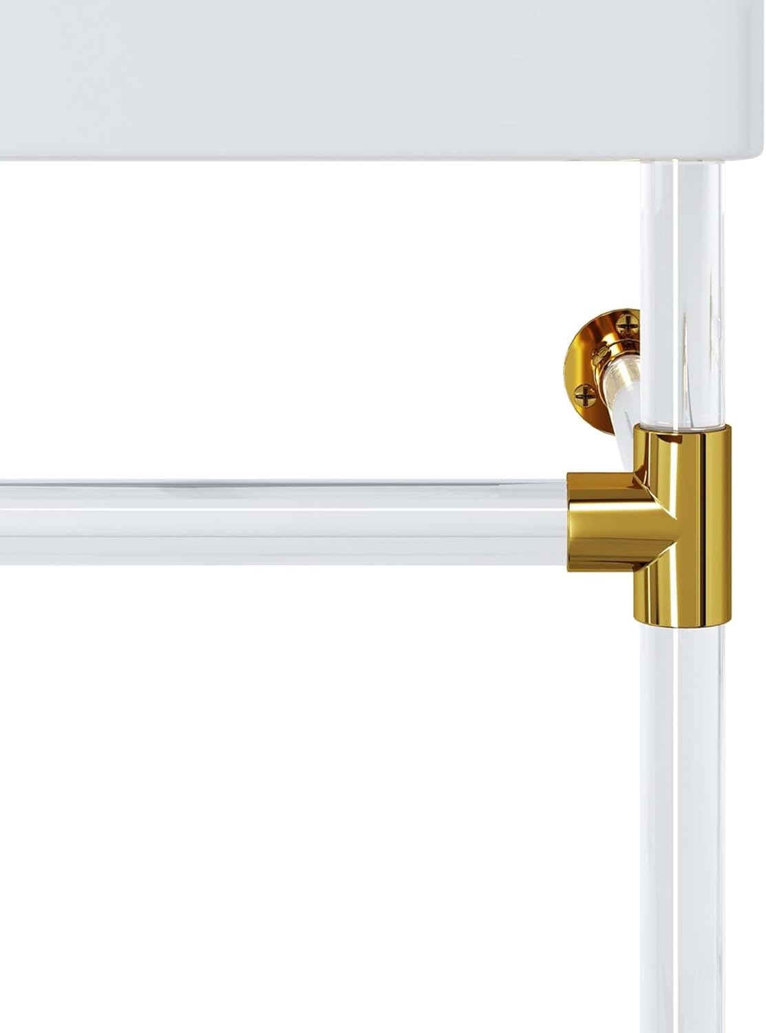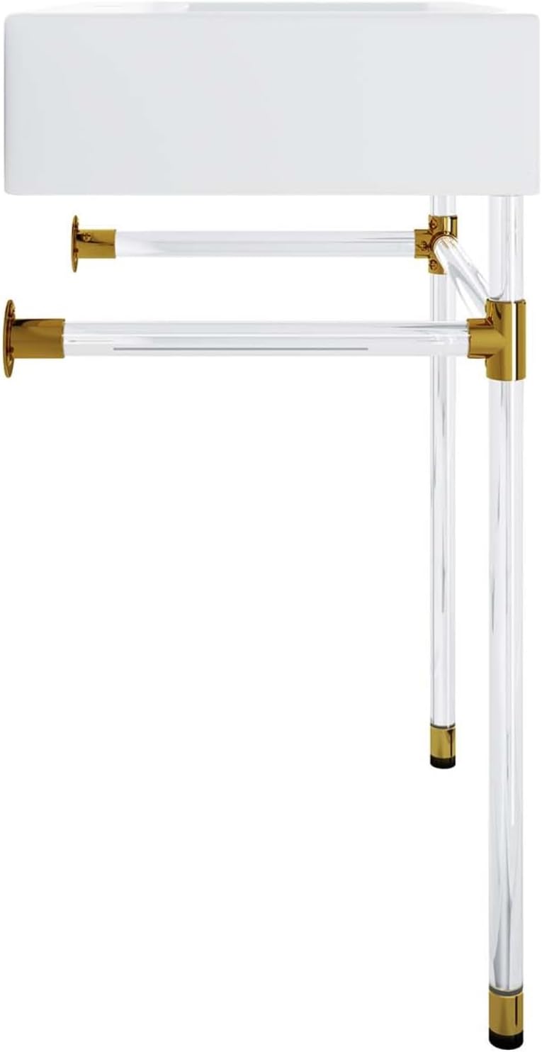 Introducing the Redeem 24" Acrylic Wall-Mount Bathroom Vanity, the perfect addition to create a luxurious bathroom oasis. With its minimalist style and efficient design, this vanity is sure to impress. The glossy white ceramic sink basin and streamlined acrylic frame affix directly and securely to your bathroom or powder room wall, giving it a sleek and modern look. The sturdy acrylic frame with gold joints adds stability and durability, ensuring that this vanity will last for years to come. Designed for spaces large and small, the Redeem vanity exudes elegance and sophistication. It features a single faucet hole, making it easy to install your preferred faucet. The non-marking foot caps protect your bathroom floor from scratches and damage. Assembly is required, but rest assured, the instructions are straightforward and easy to follow. Please note that fixtures are not included with this vanity. The dimensions of the Redeem 24" Acrylic Wall-Mount Bathroom Vanity are as follows: 23.5"L x 18"W x 33.5"H. The overall top dimensions are 23.5"L x 18"W x 6"H, while the overall base dimensions are 22.5"L x 17"W x 27.5"H. Upgrade your bathroom with the contemporary style and functionality of the Redeem 24" Acrylic Wall-Mount Bathroom Vanity. Order yours today and transform your space into a haven of relaxation and beauty.