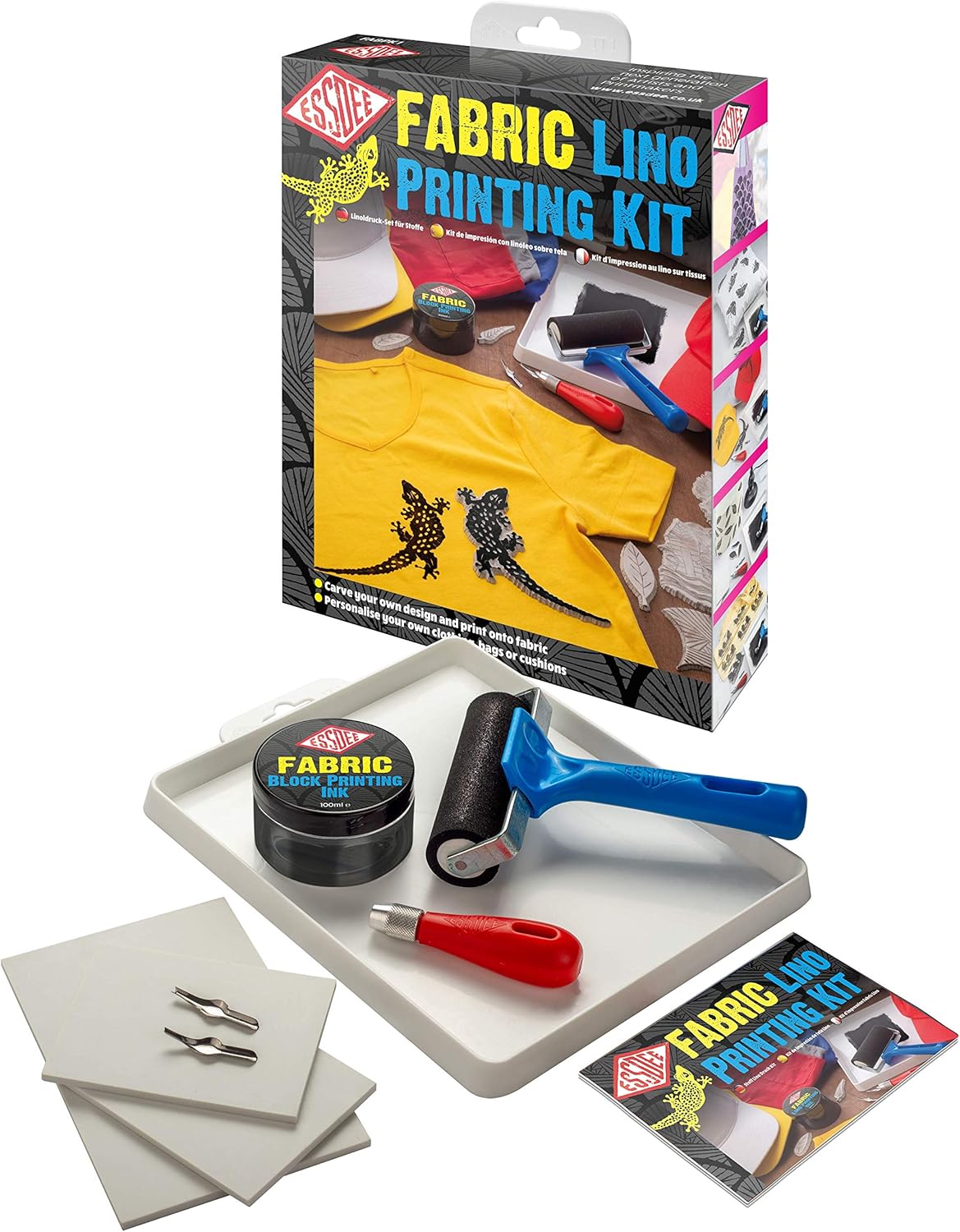 The Essdee Fabric Lino Printing Kit includes all the essential lino cutting tools and materials you need to create your own designs and print them on to fabric. The MasterCut carving blocks, Lino cutters, fabric printing ink and unique fabric roller have all been selected or designed specially to make block printing onto fabric a fun, creative and successful activity that anybody can enjoy.Essdee water-based Fabric Block Printing Ink (Black – 100ml), Three pieces of Essdee MasterCut Lino (One piece of 150x100mm and two pieces of 100x100mm), Two Essdee Lino Cutters (No1 and No4), Lino Handle with aluminium ferrule, Essdee Fabric Printing Roller (100mm wide), Ink Tray (240x200mm), Printing blanket, Comprehensive Instruction Book to guide customers through the process from start to finish.