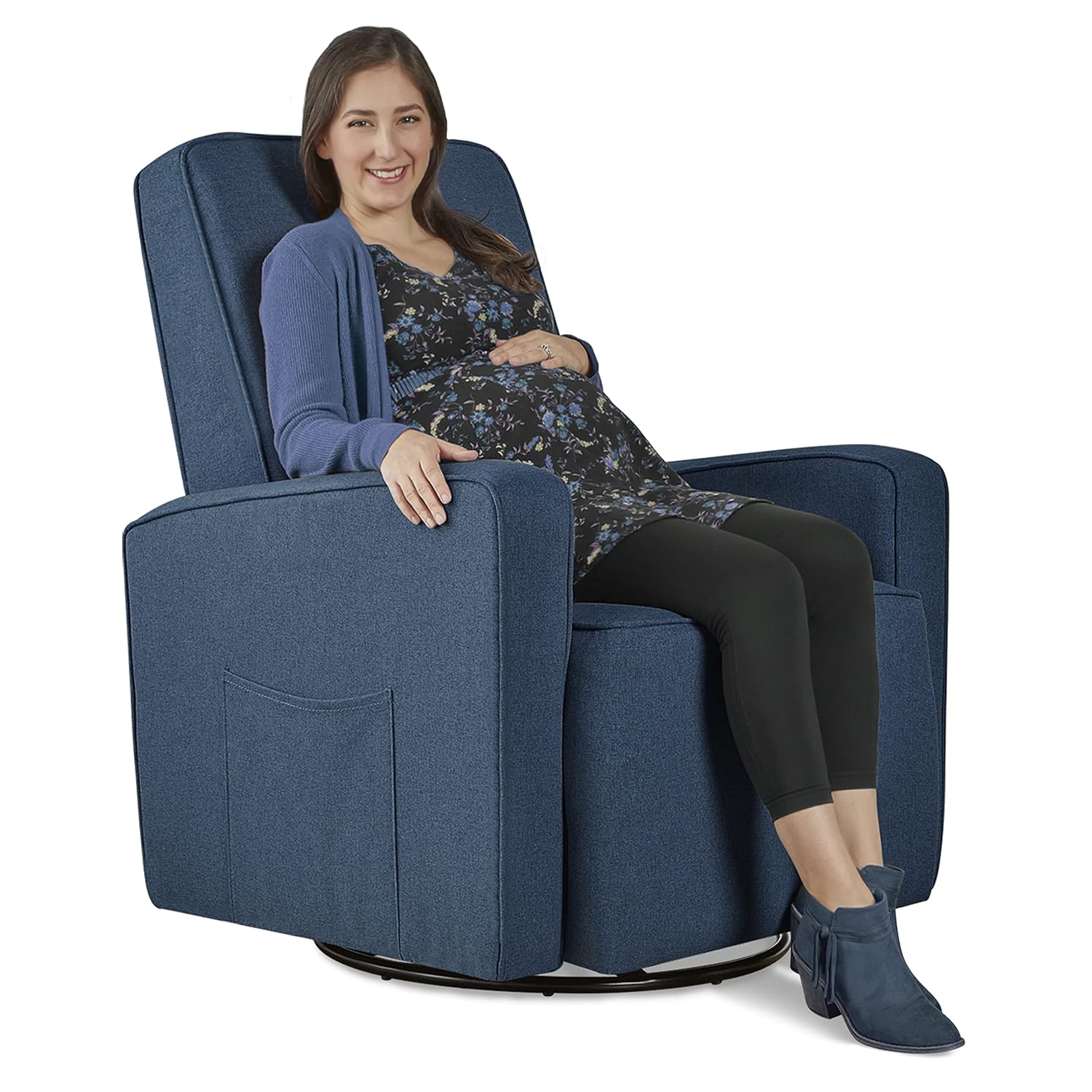 Pamper those aching muscles, nurse your baby or simply enjoy some downtime in the warm embrace of the Evolur Holland Upholstered Swivel Glider. From plush seating, a bonus lumbar pillow to the matching ottoman (SOLD SEPERATELY), the Holland spells luxury and comfort like no other! The Holland features an ergonomic high backrest, comfortable side rests, smooth gliding movements and 360° swivel motions, designed to provide maximum comfort to your body. Enjoy the advantages of a stress-free assembly with the Holland! Its solid metal base supports 360-degree swivel rotation and gliding. The Holland is covered with an soft to touch yet durable and easy-to-clean fabric with foam filling, and features convenient side pockets. Choose from three beautiful finishes - a sophisticated grey Harbor, a calming beige Thunder and a classy Navy finish. The Holland weighs 87.5 lbs. Product dimensions are 32″ L x 33″ W x 36.5″ H inches. It comes with a 1-Year Limited Manufacturer’s Warranty
