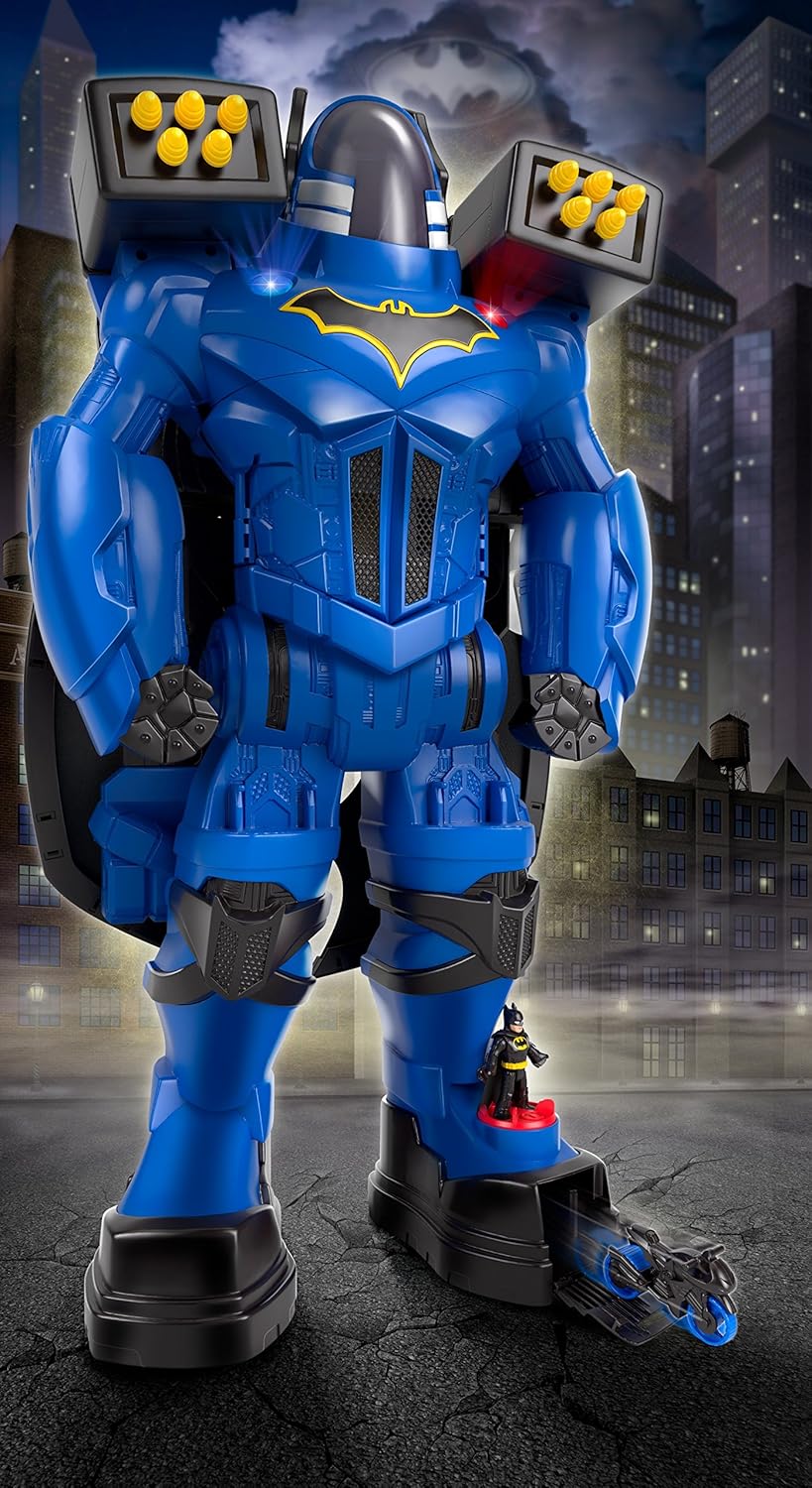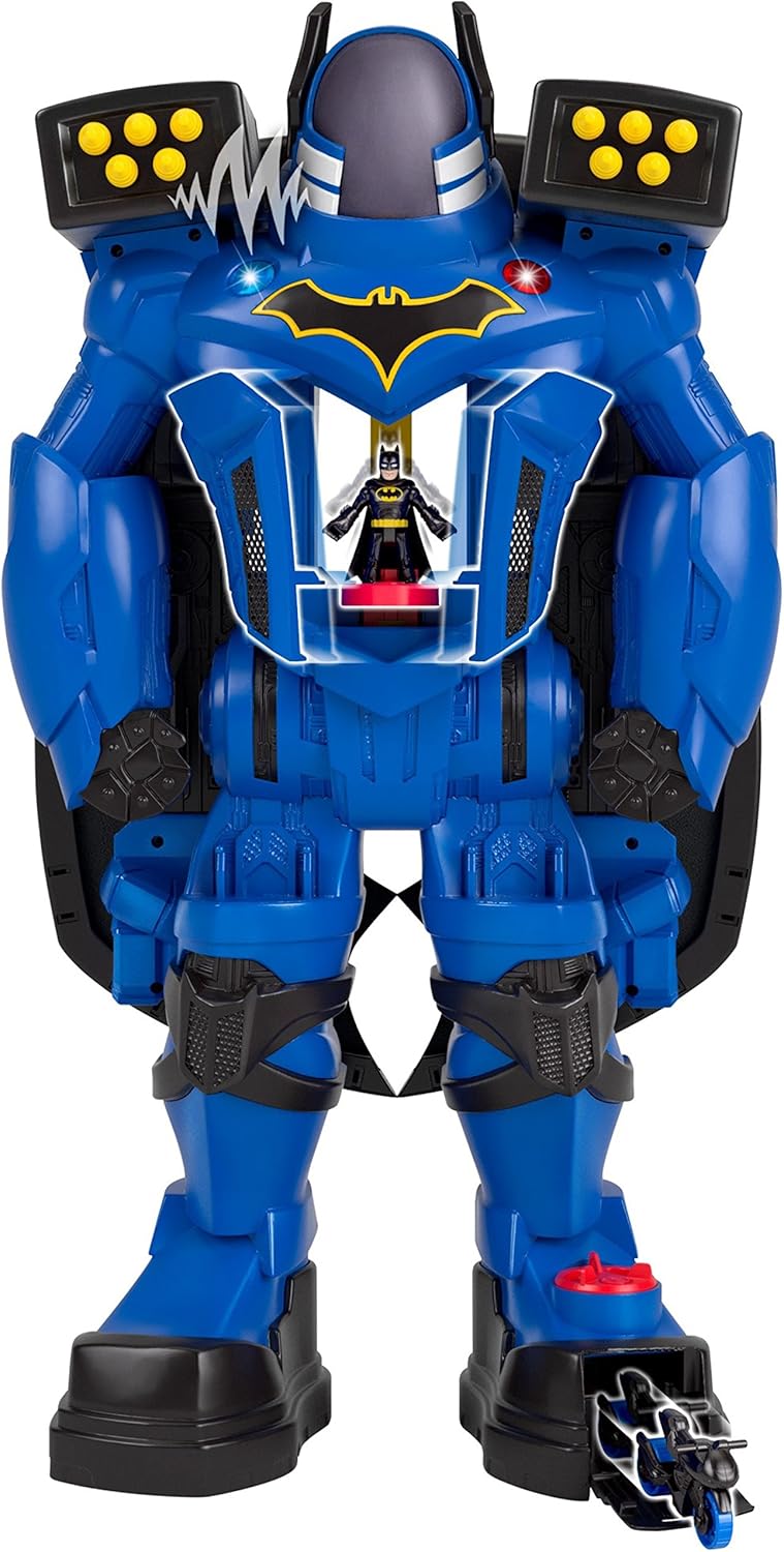 The Imaginext DC Super Friends Batbot Xtreme is the ULTIMATE toy for Batman fans. With extendable wings, multiple projectile launchers, a hidden Batcycle, a voice changer, and real punching fists, your young Super Hero will have a blast defending Gotham City from all sorts of evil Super-Villain attacks! At over two-feet tall, the Batbot Xtreme towers over the enemies of Gotham City. With the turn of a Power Pad, kids send the robot into battle mode, extending its wings and arms and preparing for action. POW! Squeeze the triggers on the back of the Batbot to give those bad guys a super-charged, one-two punch! Turn the Power Pad on the robot's left shoulder to open the chest to reveal the hidden elevator that will take Batman up to the cockpit, where he can launch a counterattack. 3…2…1…FIRE! Press the launch buttons on the robot's shoulders to fire projectiles. Kids can add their unique voice to the Batbot Xtreme with the super cool voice changer—Haha! Take that, Super-Villains! For even more action-Packed fun, turn another Power Pad to reveal the hidden Batcycle. Now your young Super Hero can send Batman racing into battle! Get kids' imaginations soaring with the Imaginext DC Super Friends Batbot Xtreme. Imaginext Imagine What's Next! Where development comes into play Cognitive: Imaginative play and storytelling helps develop kids' language skills and can foster an early love of reading.