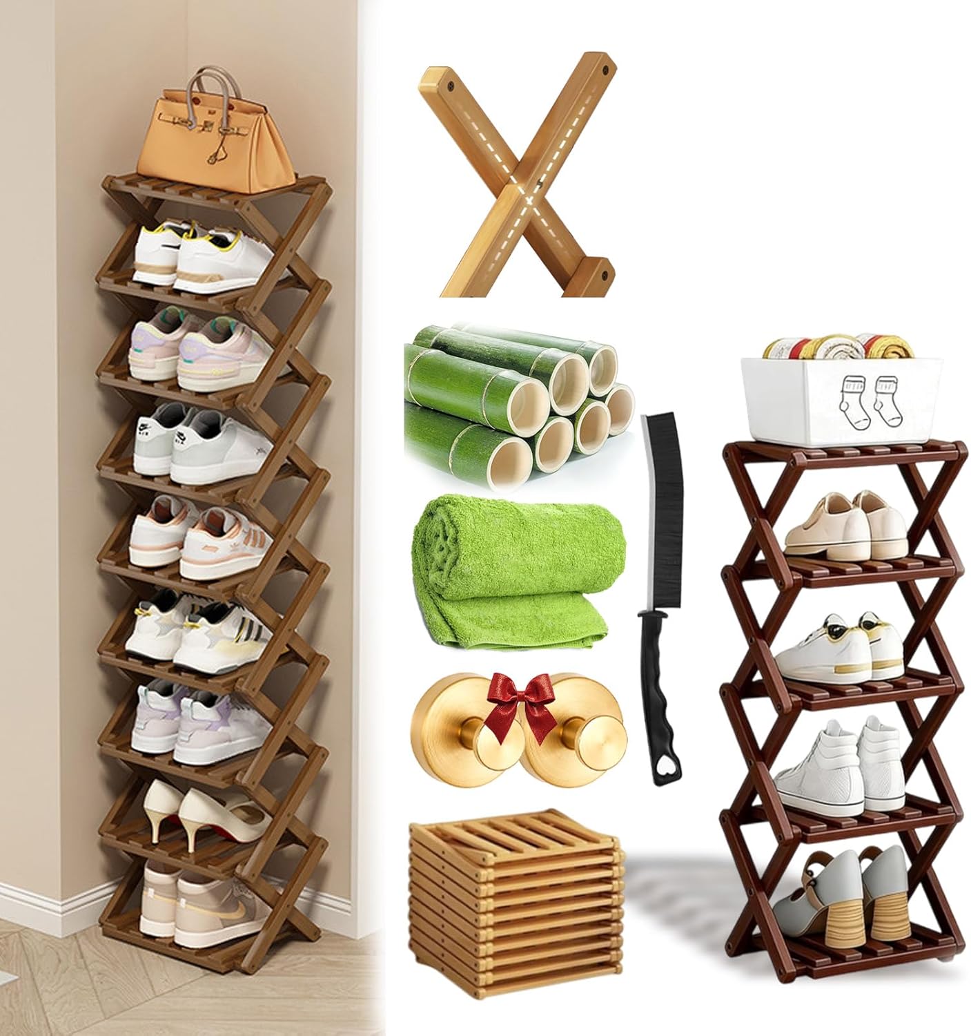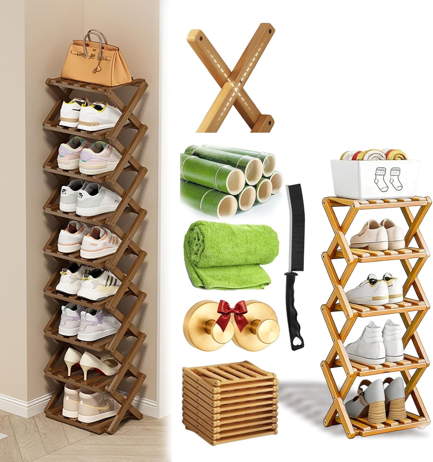 Tame the Entryway Chaos & Reclaim Your Space: Is your doorway a permanent shoe pile? You’re not alone. We designed this Foldable Bamboo Shoe Rack to be the simple, smart, and sturdy solution you’ve been searching for. It’s not just furniture; it’s your partner in creating a calmer, more organized home. Why Our Shoe Rack is Different? 1. Unlike basic single-pole designs, our X-Brace provides 4-point support for rock-solid stability. 2. Tested to hold up to 30 lbs per shelf without sagging or shaking. Safe for your heaviest boots. 3. Spills happen! Just wipe clean with a damp cloth—no special cleaners needed. 4. Moving? Renovating? Simply fold it flat in seconds. Its flexible design grows with your needs. Perfect For: 1. Apartments & Renters where space is premium and drilling isn’t allowed. 2. College Dorms that need quick, temporary organization. 3. Families with a mountain of shoes by the front door. 4. Anyone who values smart design and clutter-free living. Package Include: 1 PC * Bamboo Shoe Rack 1 PC * Cleaning Towel 1 PC * Cleaning Brush 2 PCS * Suction Cup Hooks Friendly Tips: 1. The product size parameters are manually measured, there may be slight errors, thank you for your understanding 2. The display effect of different screens is different, the picture is for reference only, please refer to the actual color of the product 3. If you have any questions about the product or order, please tell us through Amazon, we will reply within 24 hours