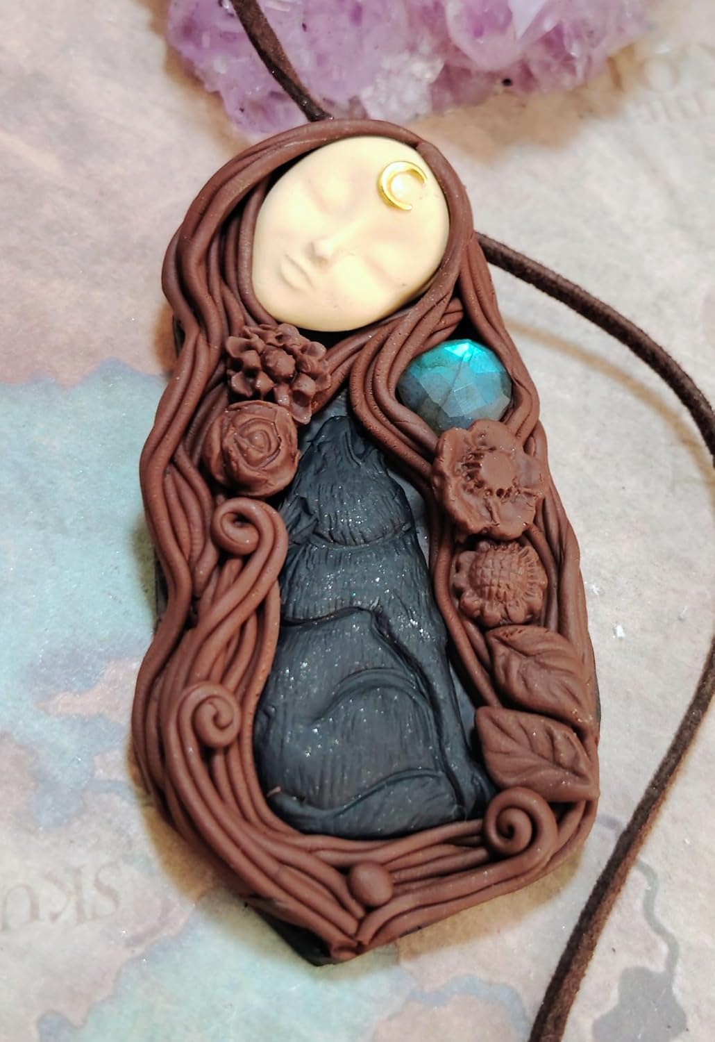This unique handsculpted piece depicts the Norse Goddess Freya next to a howling wolf with Moonstone Labradorite Full Moon. Freya's Myth:Freya The Norse goddess of everything feminine: love, beauty, sex, fertility, and gold. However, she was also at times associated with war and death. Her name translates to “Lady.” Symbols The most common symbol associated with Freya is the Brisingamen Necklace – a necklace that sparkled and shined so beautiful that Freya was willing to go to extreme lengths to have it. Legend states that one night, Freya wandered into the land of the Dwarfs. There, she saw four of them making the most beautiful golden necklace. She told them that she would pay them any amount of gold and silver for it. However, the Dwarfs were not interested in money. They told Freya that the only way they would give her the Brisingamen was if she would sleep with each one of them. Freya loathed the idea of sleeping with the hideous Dwarfs, but her desire burned so strongly for the Brisingamen that she agreed to their demands. After four nights of sleeping with each one, they made good on their deal, and gave it to her. Another symbol Freya is associated with is her golden chariot pulled by two blue cats, a gift from Thor. Sometimes she also rode the boar Hildisvini, who was her faithful companion. Powers & Duties Freya is the Norse goddess of love, sex and fertility. As the goddess of love and sex, Freya was sought after by prominent Jotnar, the giant gods who were constantly at war with the Aesir. The Jotnar wanted her hand in marriage. It is also believed that Freya was the first to bring the art of seidr, a type of sorcery practiced during the Late Scandinavian Iron Age, to the gods. She had the knowledge and power to control others’ good fortune and desires.