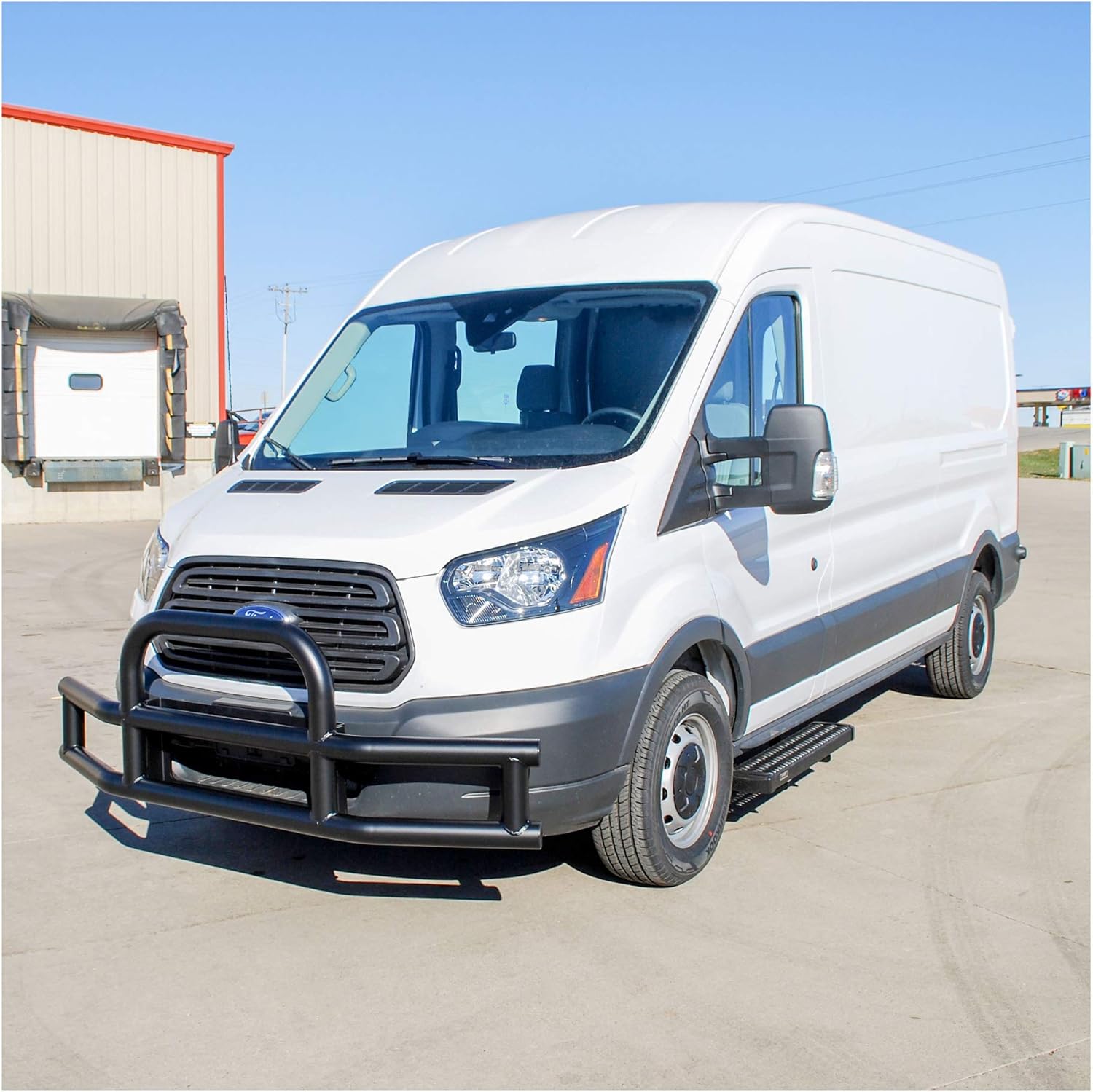 The LUVERNE Tuff Guard is the front bumper protector of choice for commercial vans that are ready to work. This heavy-duty brush guard features the fitment of a grille guard with the functionality of a bumper to give you style and extra protection. It is built with stainless steel tubing, welded together to be structurally strong and perfectly suited to fit your front end. The stainless steel is both strong and corrosion-resistant and is covered in a durable, textured black powder coat. While some aftermarket bumpers and van bumper guards are merely designed to add a flashy appearance, others are purely focused on utility with no style at all. The LUVERNE Tuff Guard combines the best of both worlds, featuring heavy-duty 3" diameter tubing, laid out in an attractive double-stack design to add front-end protection and a sleek, professional look to your cargo van. The tubing is a 14-gauge stainless steel for increased strength, and it features MIG welds for maximum rigidity. To make the Tuff Guard even tougher, we construct it from 409 stainless steel. A stainless steel construction allows it to easily withstand rust and the elements and provide long-lasting protection for your vehicle. We cover each Tuff Guard van bumper guard in a textured black powder coat for maximum corrosion resistance. This custom van bumper guard fits specific years of the Ford Transit-150, Transit-250 and Transit-350 (see application info to confirm fitment). It mounts using high-strength steel brackets with a durable black powder coat finish to ensure reliability job after job. The Tuff Guard can also accept 3" accessory mounting tabs #390103 for attaching LED work lights, a license plate bracket or other cargo van accessories.