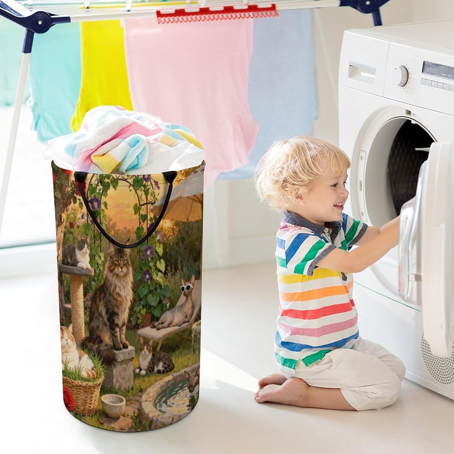 The pattern of the Garden Meow Language hamper is printed with exquisite patterns, which makes the product more attractive.Chic design allows it to be used in the living room to hold throw blanket, pillows, and reading materials, as well as in the bathroom for towels, or as a laundry hamper.The laundry hamper adopted collapsible design, equipped with handles. It is lightweight and portable for using, storing, and moving conveniently.Garden Meow Language Clothes hamper is suitable to store dirty clothes washing, place in the room to store toys, and other household goods, keep the house clean and tidy. Perfect laundry hamper for home, office, closet organizer, bedroom, bathroom, college dorm, etc.Gets out of your way when you need it to. This storage basket or laundry hamper is a good gift, which not only meets everyday storage needs but also carries deep care and love, a perfect way to turn thoughtfulness into warmth.