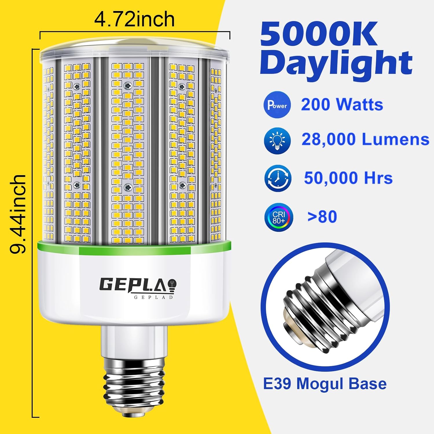 200W LED corn bulb Application: The bulb is great for workshop, garage, office building, hospital, basement, porch, street, school, underground parking and other places that require bright light. Specification: Item: 200W LED Corn Light Base Type: E39 Wattage: 200W Type of Chips: SAMSUNG 2835 SMD Chip Kelvin: Daylight(5000K) Lumen: 28,000LM Luminous Efficiency: 140Lm/w Working Voltage: AC100-305V Lamp Power Factor:≥95 Color Rendering Index (CRI): 80 Wide Ambient Operating Temperature: -10℃to +40℃ Bulb Features: Not Dimmable Average Life: >50000 hours Dimension: 9.44 inch(Length) x 4.72 inch(Diameter) Pros: Energy efficient Low maintenance costIndoor and outdoor lighting Smart solution Package Include: 200W LED Corn Light x 2 E39 to E26 Adapter x 2 x 2