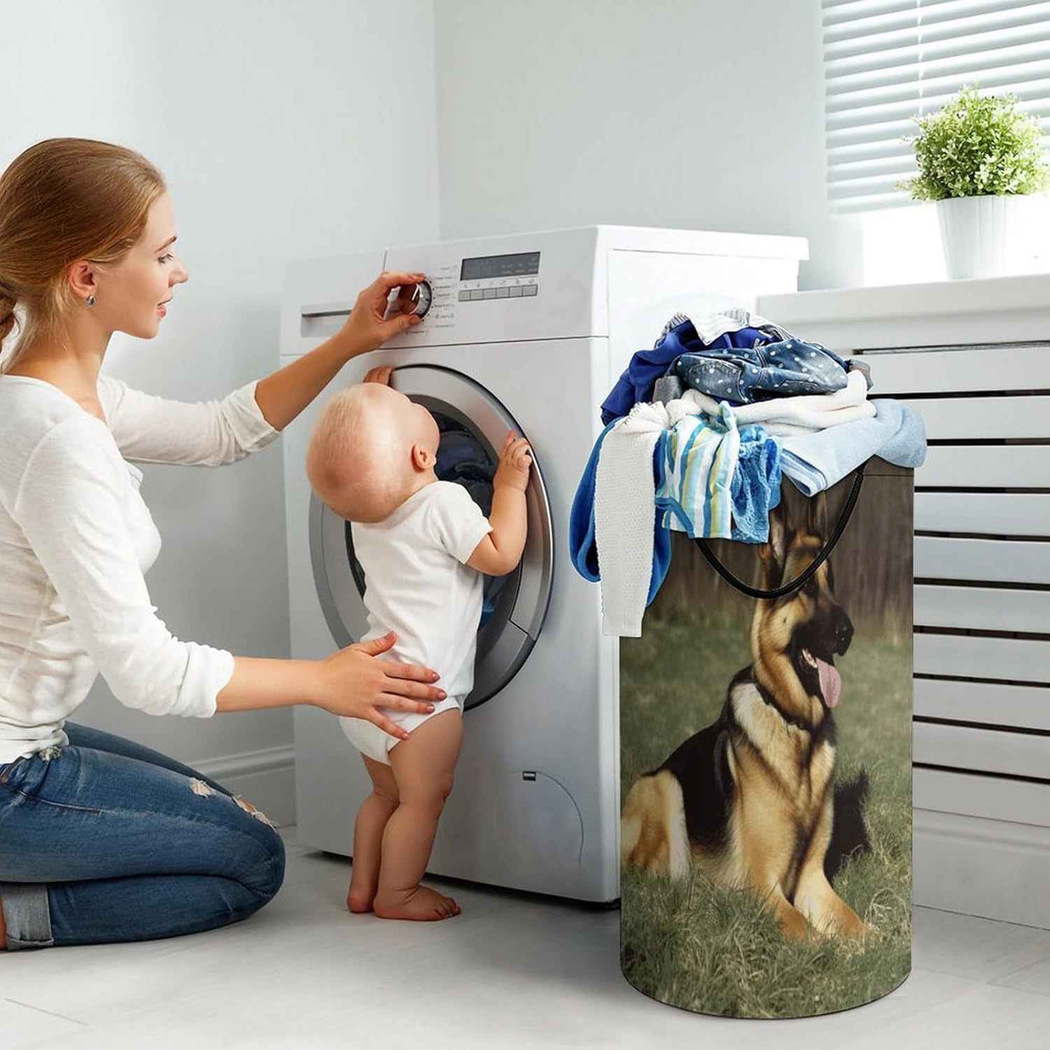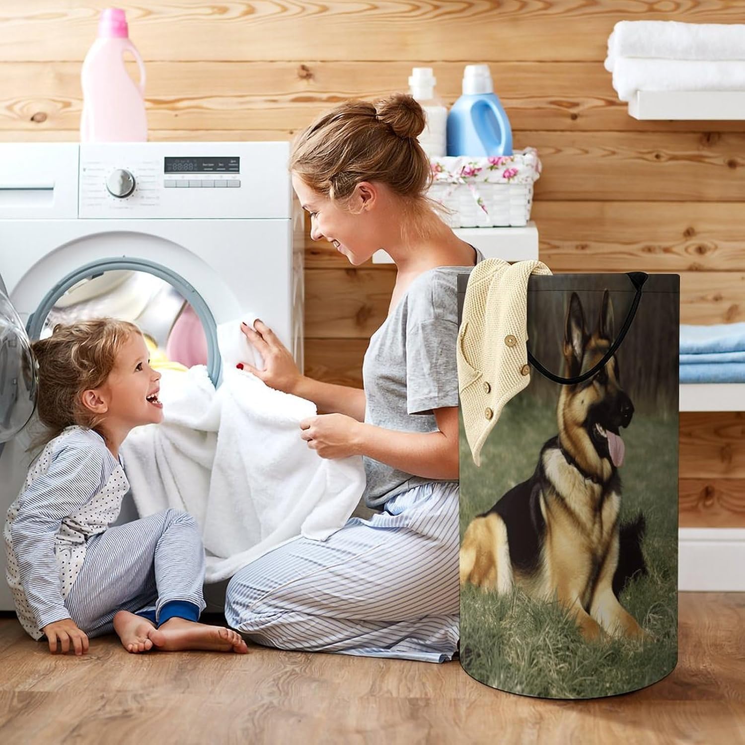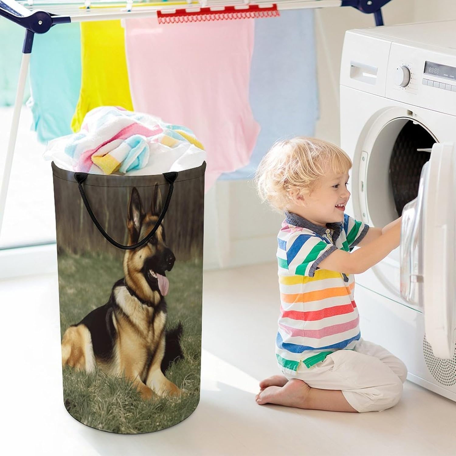 The pattern of the German Shepherd Dog hamper is printed with exquisite patterns, which makes the product more attractive.Chic design allows it to be used in the living room to hold throw blanket, pillows, and reading materials, as well as in the bathroom for towels, or as a laundry hamper.The laundry hamper adopted collapsible design, equipped with handles. It is lightweight and portable for using, storing, and moving conveniently.German Shepherd Dog Clothes hamper is suitable to store dirty clothes washing, place in the room to store toys, and other household goods, keep the house clean and tidy. Perfect laundry hamper for home, office, closet organizer, bedroom, bathroom, college dorm, etc.Gets out of your way when you need it to. This storage basket or laundry hamper is a good gift, which not only meets everyday storage needs but also carries deep care and love, a perfect way to turn thoughtfulness into warmth.