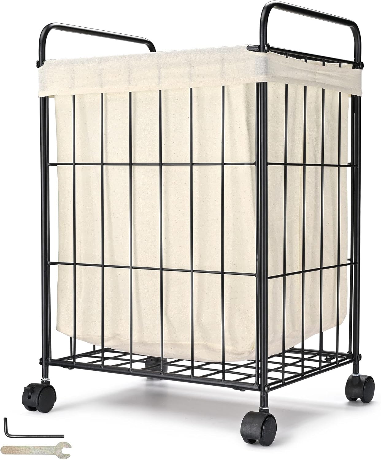 Multi-functional & Portable - 15 9/16" x 11 13/16" x 23 5/8" Aquaterior Laundry Hamper with rolling wheels to ensure easy movement, provides temporary storage for your dirty clothes, towels, and toys An easy solution to keep your room tidy and clean, perfect for use in your bedroom, bathroom, laundry room, kids’ room Industrial Chic Style - Features black iron wire frame and white canvas bag for presenting a clean minimalist look, perfectly complementing your home decoration with a chic industrial style Easy Mobility - Equipped with 4 pcs 360-degree swivel casters to enable multi-direction movement