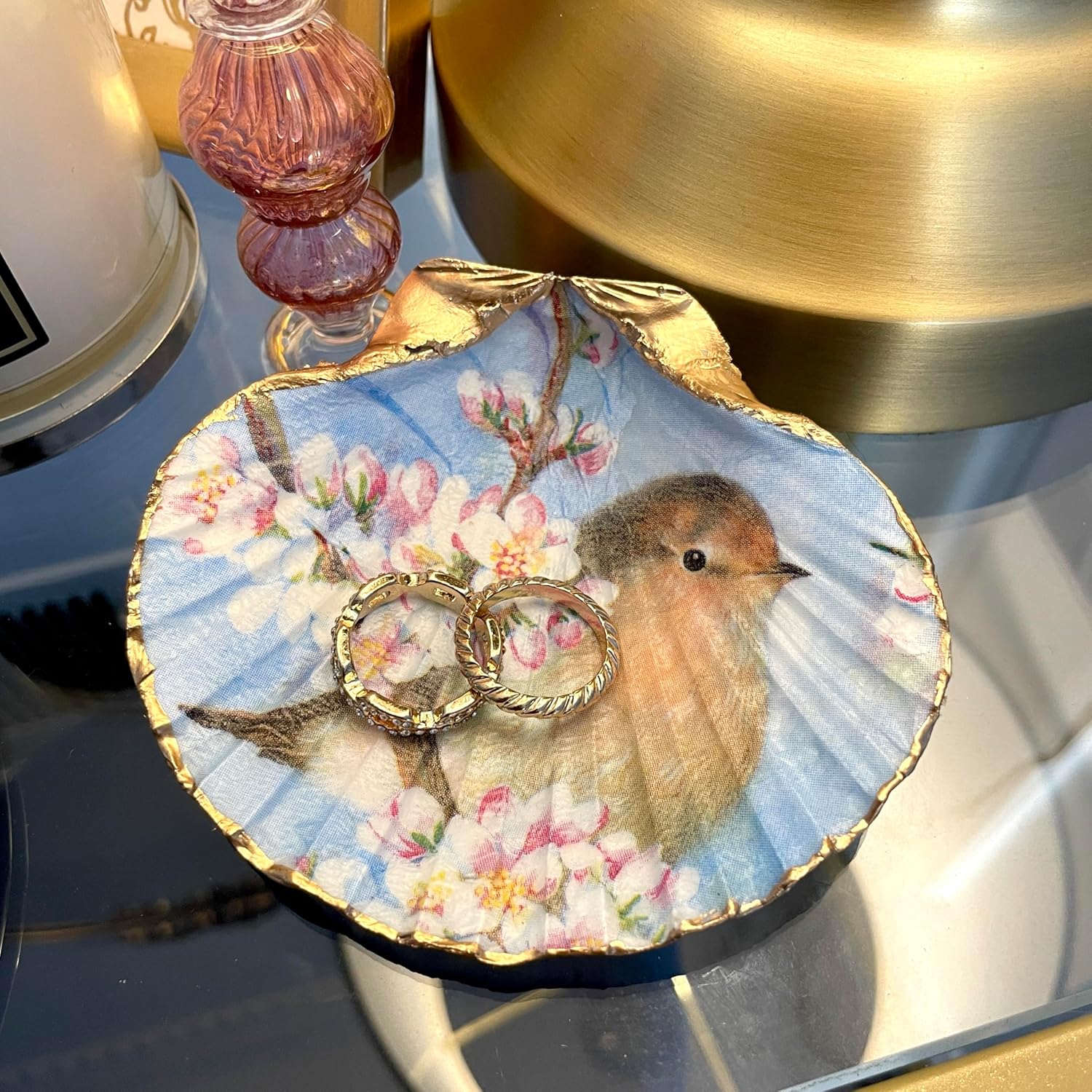 These gorgeous premium quality trinkets are handmade with love and care in my private studio in Northern Virginia. Each shell is carefully handpicked from the shore, thoroughly cleaned, and sun-dried before being transformed into a timeless keepsake. Once designed, the edges are delicately gold-leafed and sealed, leaving the back in its natural state to preserve the shell’s authentic beauty. Because every shell was once home to a small sea creature, no two are ever alike—each one is a true one-of-a-kind treasure. These coastal chinoiserie-inspired artisan pieces can be used as jewelry trinkets, ring holders, medicine trays, or elegant home decor accents. Their vintage, handmade, grandmillennial charm makes them perfect as personalized gifts, wedding favors, stocking stuffers, or thoughtful additions to your home. Crafted with sustainable, organic, and eco friendly materials, each shell embodies the spirit of natural beauty and mindful craftsmanship. Ideal for creative women, brides, moms, sisters, or friends, they make memorable gifts for birthdays, anniversaries, Valentine’s Day, Mother’s Day, Christmas, holidays, or bridal showers. Thank you for supporting my small business and helping keep the art of handmade creativity alive.