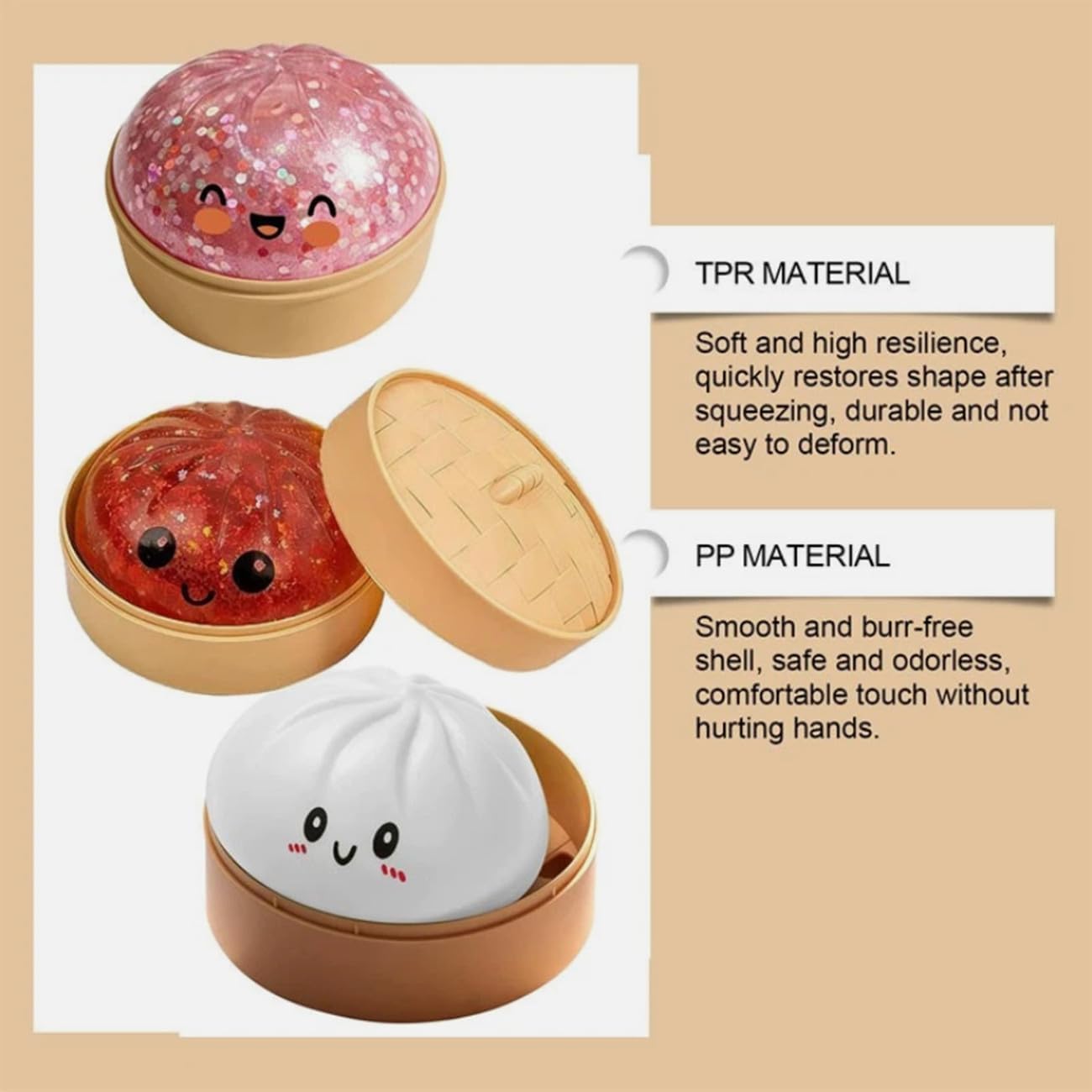 Specifications: Name: Steamed Bun Stress Relief Toy Material: TPR Colors: White, Gold, Red, Blue Package Includes: 1 × Dumpling Squishy Toy 1 × Steamer Style Container Warm Note: 1.Please Allow Slight Size Errors Due to Manual Measurement. 2.Due to Differences Between Monitor Displays, Actual Color May Vary Slightly from Image.Thanks for Your Understanding. 3.If You Have Any Questions, Please Get in Touch with Us at Any Time, We Will Provide You with Best Solution. 4. 1cm=0.39in