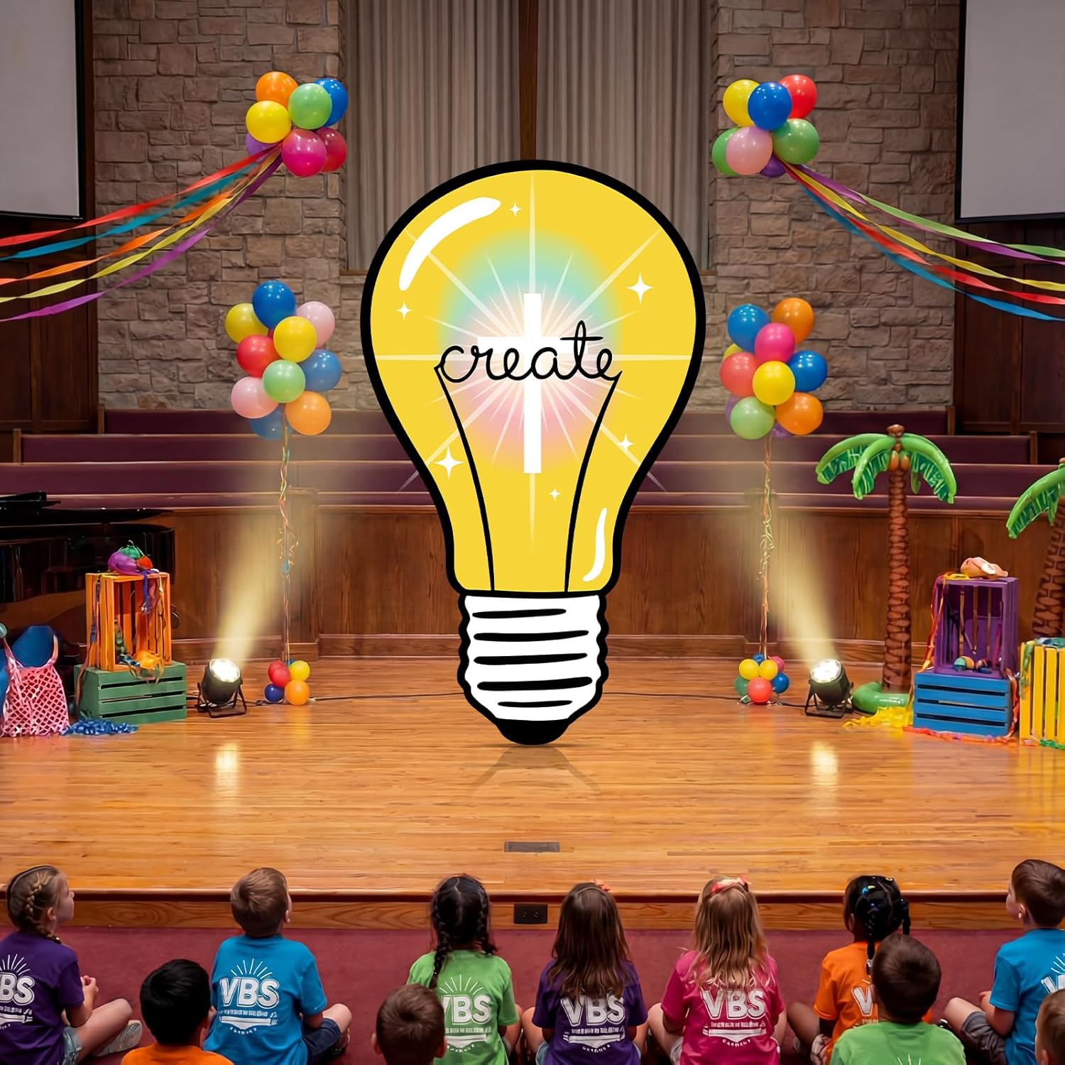 Features: Enhances overall atmosphere: By incorporating this thematically strong standee, you can quickly create a cohesive and inspiring vbs activity environment. It adds a professional and joyful decorative element to your church vacation bible school an effective tool for atmosphere creation. Practical summary: In summary, this large yellow plastic hollow board standee combines thematic relevance, visual and practical convenience. From the striking design of the 2026 vbs illumination light bulb standee to its easy-to-store properties Specifications: Material: plastic hollow board Color: yellow, white, black Size: about 3.81 x 6.2 ft/ 1.16 x 1.89 m Package includes: 1 x Light bulb standee Notes: Manual measurement, please allow slight errors on size. The color may exist a slight difference due to different screen displays