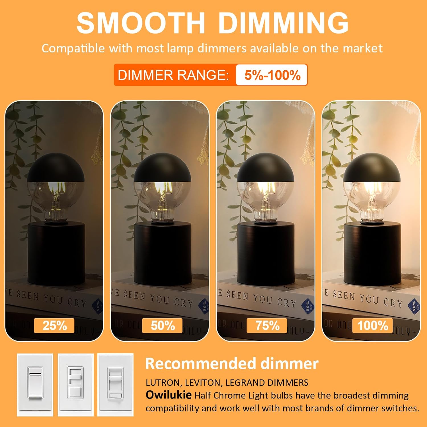 • Dimmable 2024 upgraded Half Chrome Light Bulb : The dimmable range of Half Chrome Light Bulb is 0%-100%, and its dimmable function can help you create any lighting atmosphere you want, you can adjust the brightness of the bulb from 0% to 100% according to the lighting atmosphere you need. The classic-looking E26 LED bulb with dimmable features turns any light fixture into a work of art, offering a nostalgic glow and retro charm