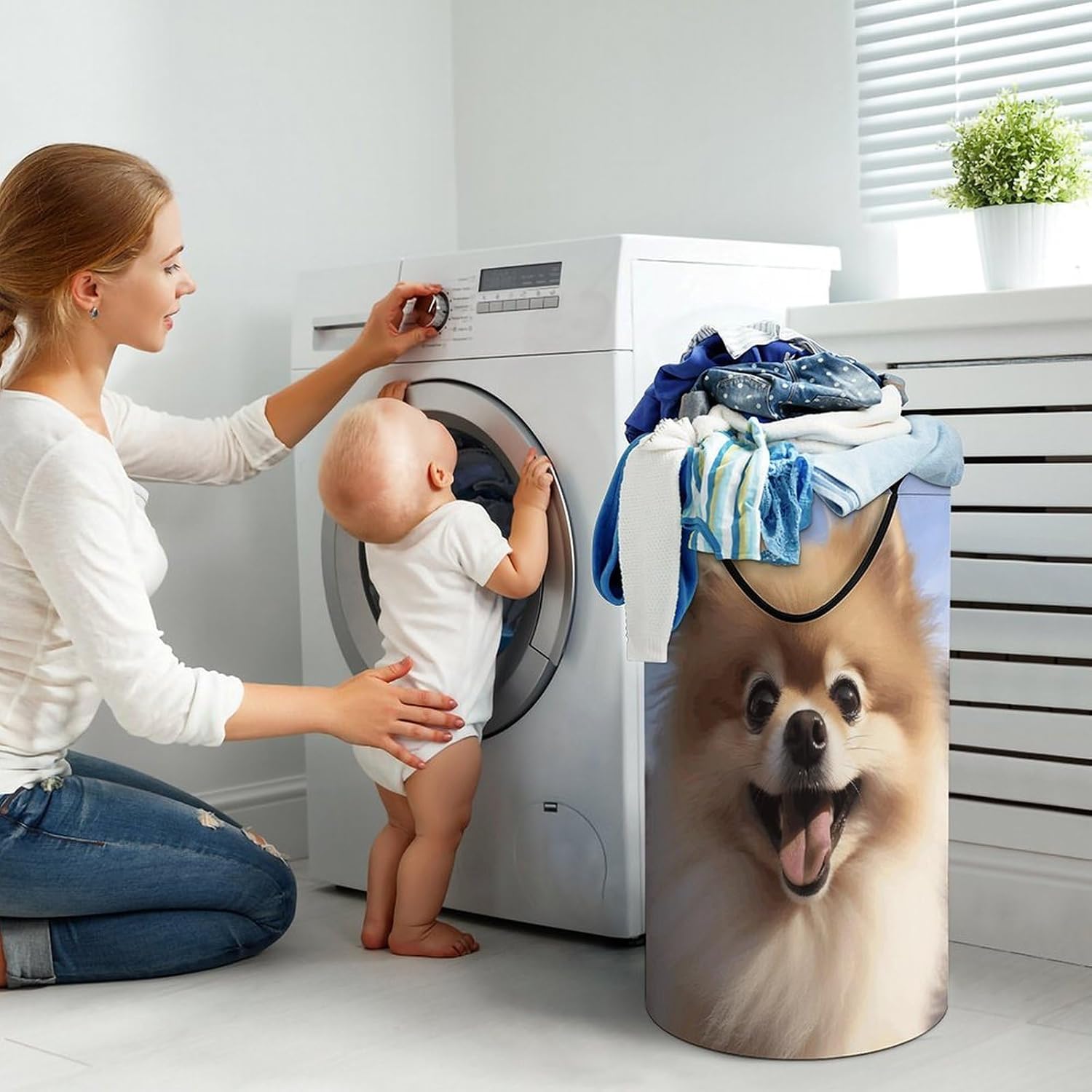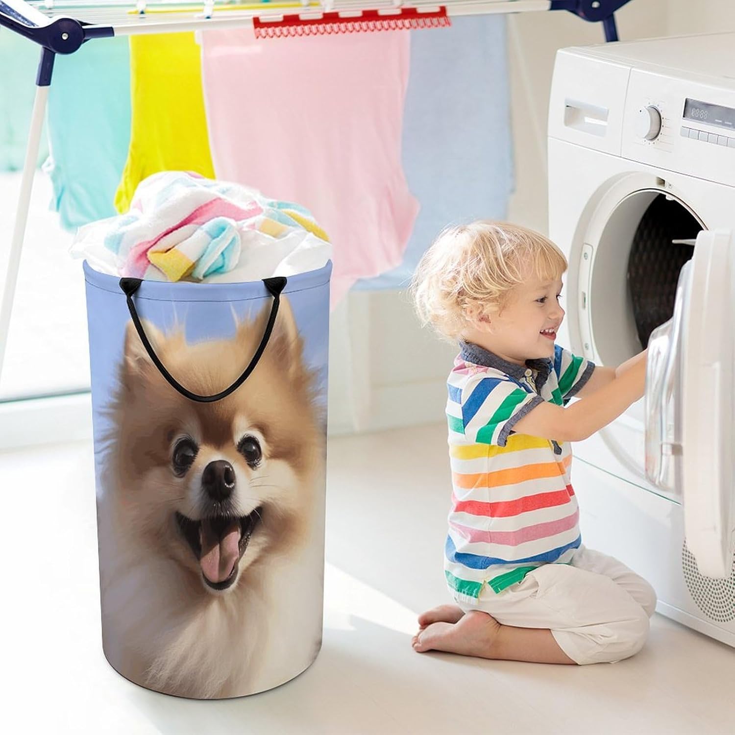 The pattern of the Happy Pomeranian hamper is printed with exquisite patterns, which makes the product more attractive.Chic design allows it to be used in the living room to hold throw blanket, pillows, and reading materials, as well as in the bathroom for towels, or as a laundry hamper.The laundry hamper adopted collapsible design, equipped with handles. It is lightweight and portable for using, storing, and moving conveniently.Happy Pomeranian Clothes hamper is suitable to store dirty clothes washing, place in the room to store toys, and other household goods, keep the house clean and tidy. Perfect laundry hamper for home, office, closet organizer, bedroom, bathroom, college dorm, etc.Gets out of your way when you need it to. This storage basket or laundry hamper is a good gift, which not only meets everyday storage needs but also carries deep care and love, a perfect way to turn thoughtfulness into warmth.