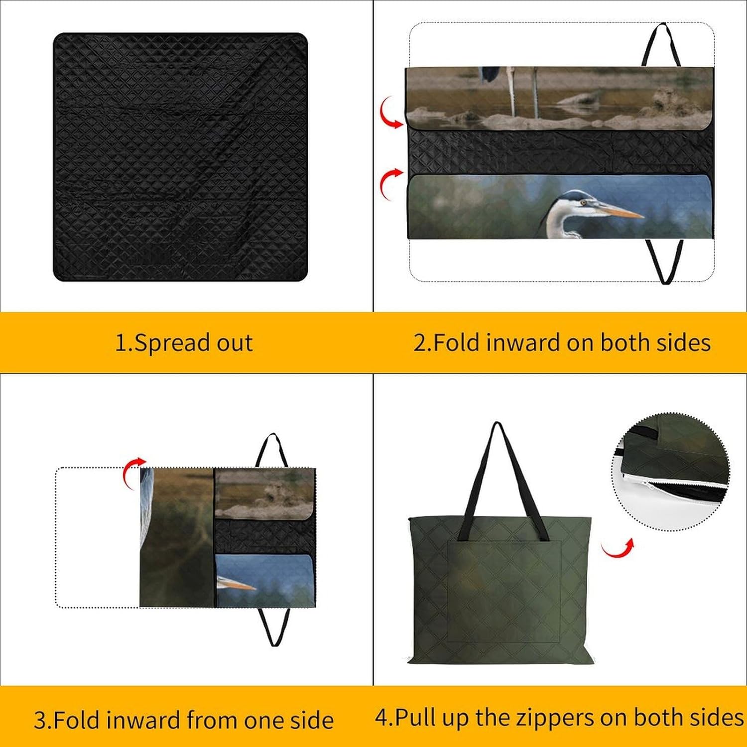 The picnic blanket ,we've only used the highest quality materials, so every picnic is an experience .The underside lining is very sturdy and therefore suitable for every surface. No more worrying about dirty or wet bottoms when you are sitting on damp grass. The Heron blanket protects you from water, dust and dirt.A large capacity bag and a picnic blanket, 2in1. It has a large capacity and one bag can hold everything you need for going out. You choose the place you want to lie down, and this bag can be turned into a comfortable picnic blanket in seconds also it can fold into tote bag, which is waterproof, sand-proof and wear-resistant.Therefor,you can take it to nearby parks, campuses, beaches or lawn, anywhere you want to lie down.