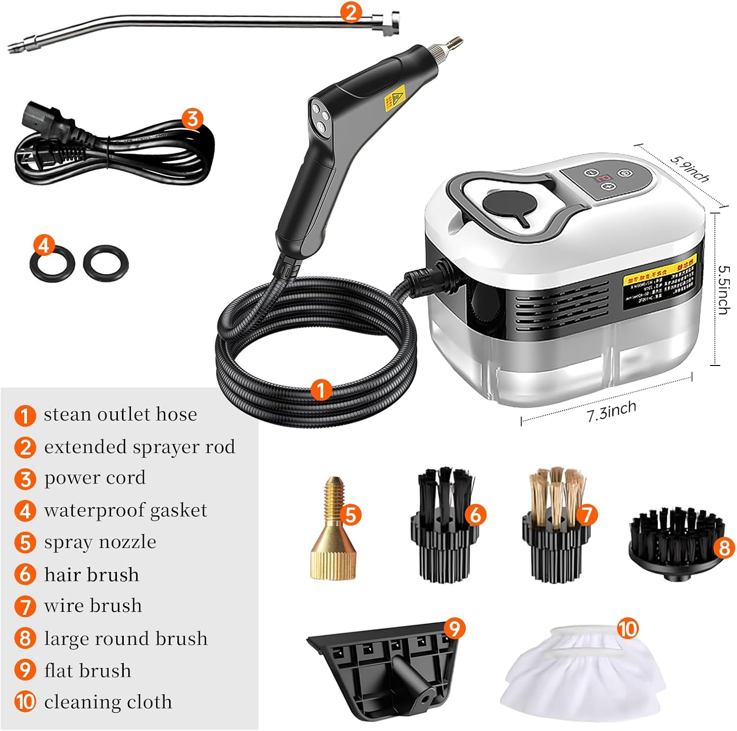 | Included Components | 1*Steam machine with tank, 1* power cord, 1* steam pipe, 1* large plastic brush, 1* small plastic brush, 1 steel brush, 1* extension rod, 2*gasket, 1*Flat brush, 1*Cleaning Cloth Sleeve, 1* user manual |