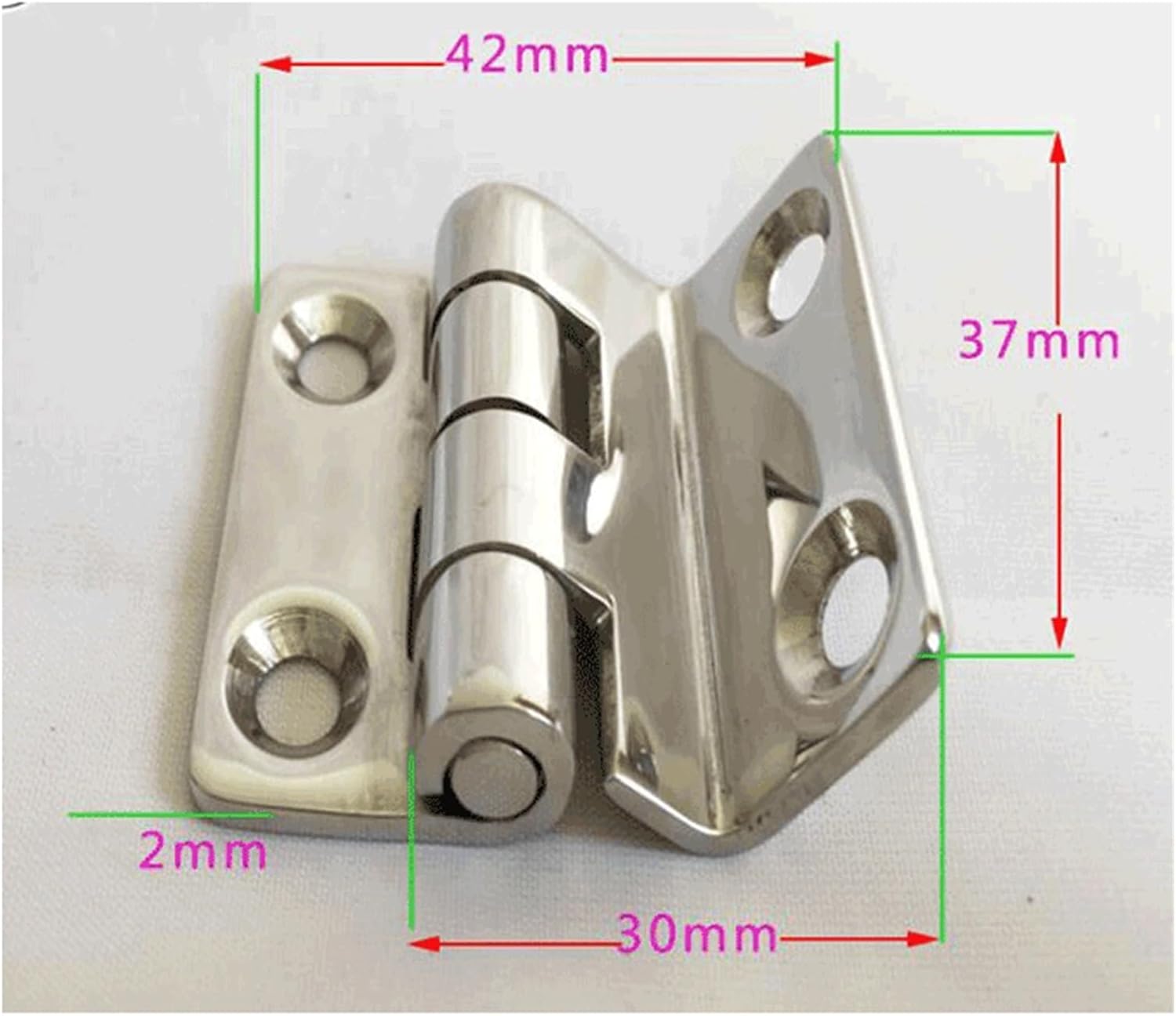 "Product parameterProduct name: Ship door hingeProduct material: stainless steelProduct color: silverSuitable for boats, lockers, cabinets, decks, tool boxes, etc.size: 42 x 38 mm/1.7 x 1.5 inchesPackage includes: 2X Ship door hinge (excluding other products)prevention:1. Due to the different display and lighting effects, the actual color of the product may be slightly different from the color shown in the picture.2. Due to manual measurement, please allow the measurement deviation to be 1-3mm."