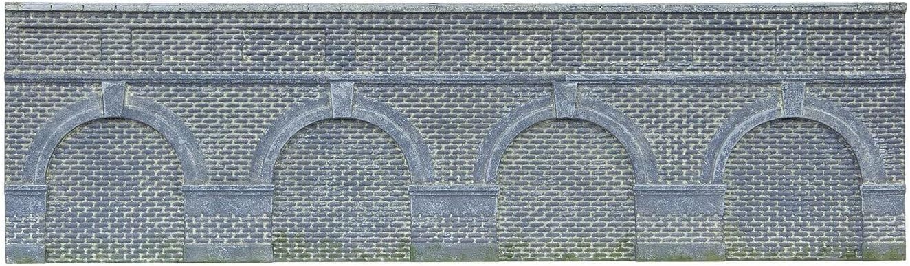 A pack of 2X scenic blue brick Low Level Arched Retaining Walls as would be found lining an embankment or railway cutting.