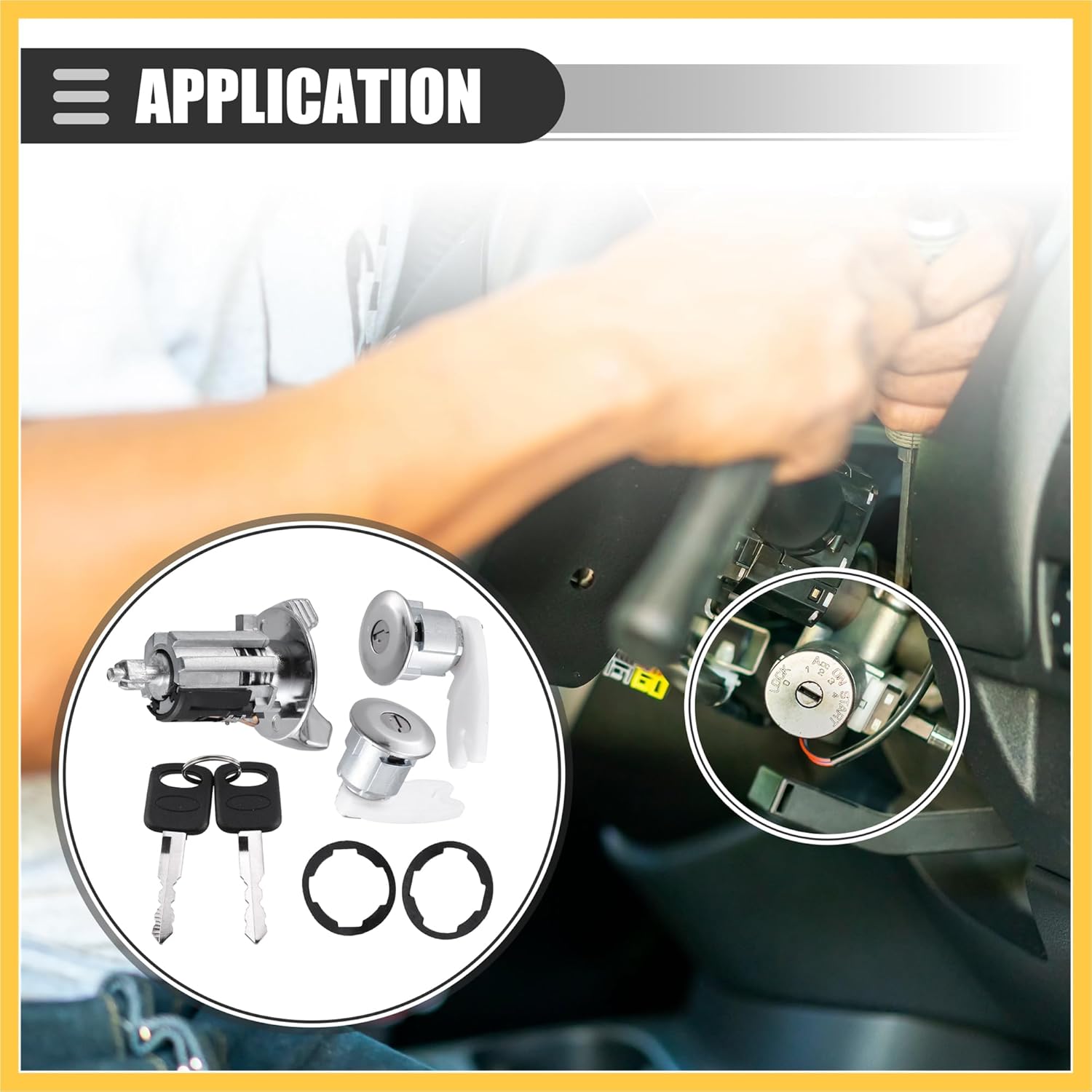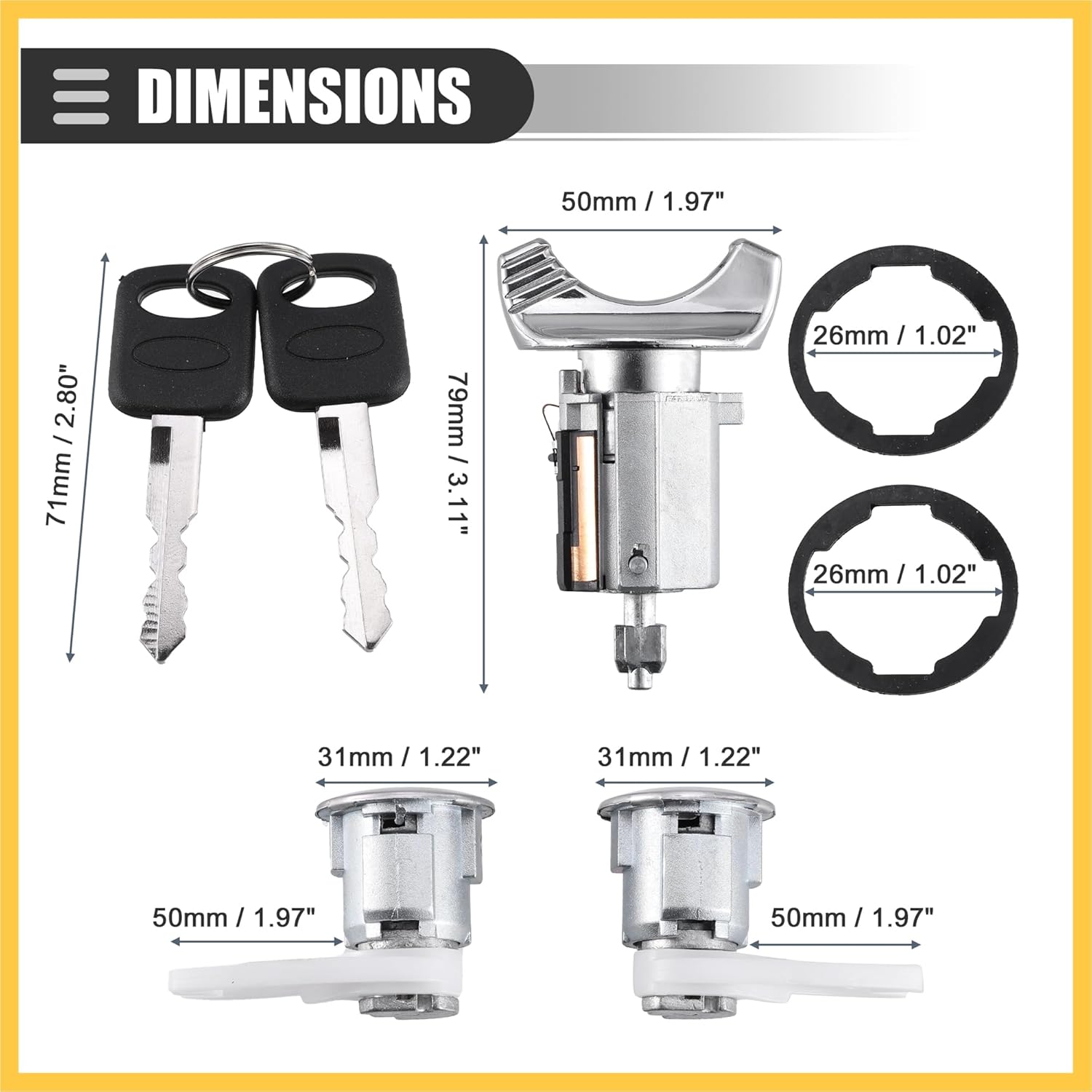Vehicle Specific Fit:for Ford F150 250 350 Pickup 1992-1995for Ford E150 250 350 Van 1992-1995for Ford Bronco 1992-1995for Ford Crown Victoria 1990-1991for Ford Aerostar 1994for Mercury Grand Marquis 1990-1991Product Details:Color: Black, Silver ToneMaterial: Plastic MetalIgnition Lock Cylinder Size: 79 x 50mm / 3.11" x 1.97"Keys Size: 71mm / 2.80"Placement on Vehicle: Steering Ignition Side, Door SideAdvantage:The ignition key lock cylinder is made of quality material, which is wearable, durable, and scratch-resistant.Easy to install, direct replacement for the old or broken one.Kindly Notes:This is non-OEM product, accessory ONLY!Please carefully check your vehicle model year to ensure you get the correct part.Please allow slight dimension differences due to different manual measurements.Package Content:1pc Ignition Key Switch Lock Cylinder2pcs Door Lock Cylinders2pcs Gaskets2pcs Keys