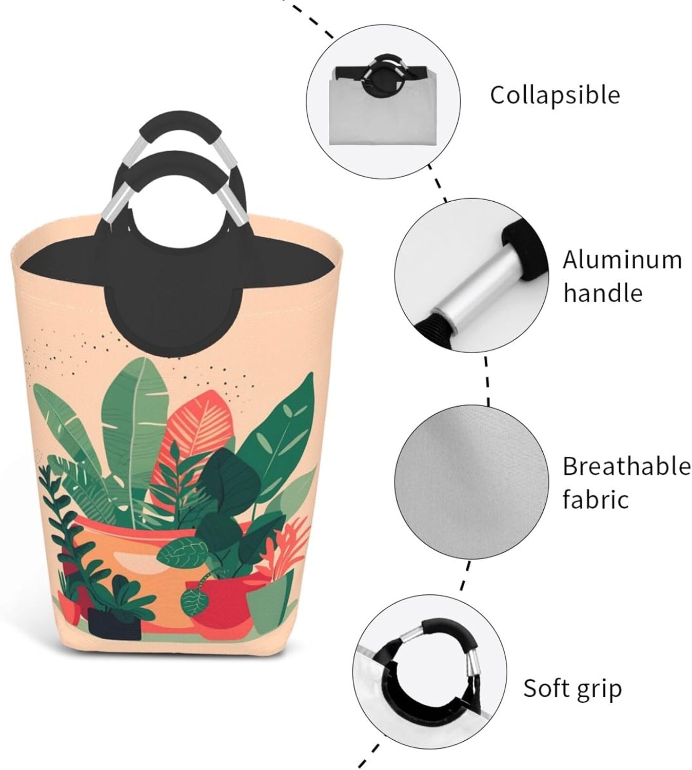 Our Indoor small green plants dirty clothes storage bag is made of polyester, which is lightweight and flexible. It can maintain a stable shape even under heavy pressure and collision. At the same time, the incorporation of Oxford cloth material significantly improves the durability of the product, and it is resistant to wear, bumps and pulling. The storage bag is designed with a large capacity, which can easily carry winter clothes, daily clothes and a variety of sundries. It is easy to carry and store, and fits tightly into the gap of the suitcase after folding. The aluminum handle is sturdy and reliable, supports hanging, and is suitable for a variety of places. In terms of design, it adopts leak-proof technology, combined with waterproof coating and precision sewing, which is effectively waterproof. The exterior uses cutting-edge transfer technology, and a PE board support is added at the bottom to ensure stable load-bearing and prevent tipping. This storage bag is practical and easy to use, and is an ideal choice for travel and home.