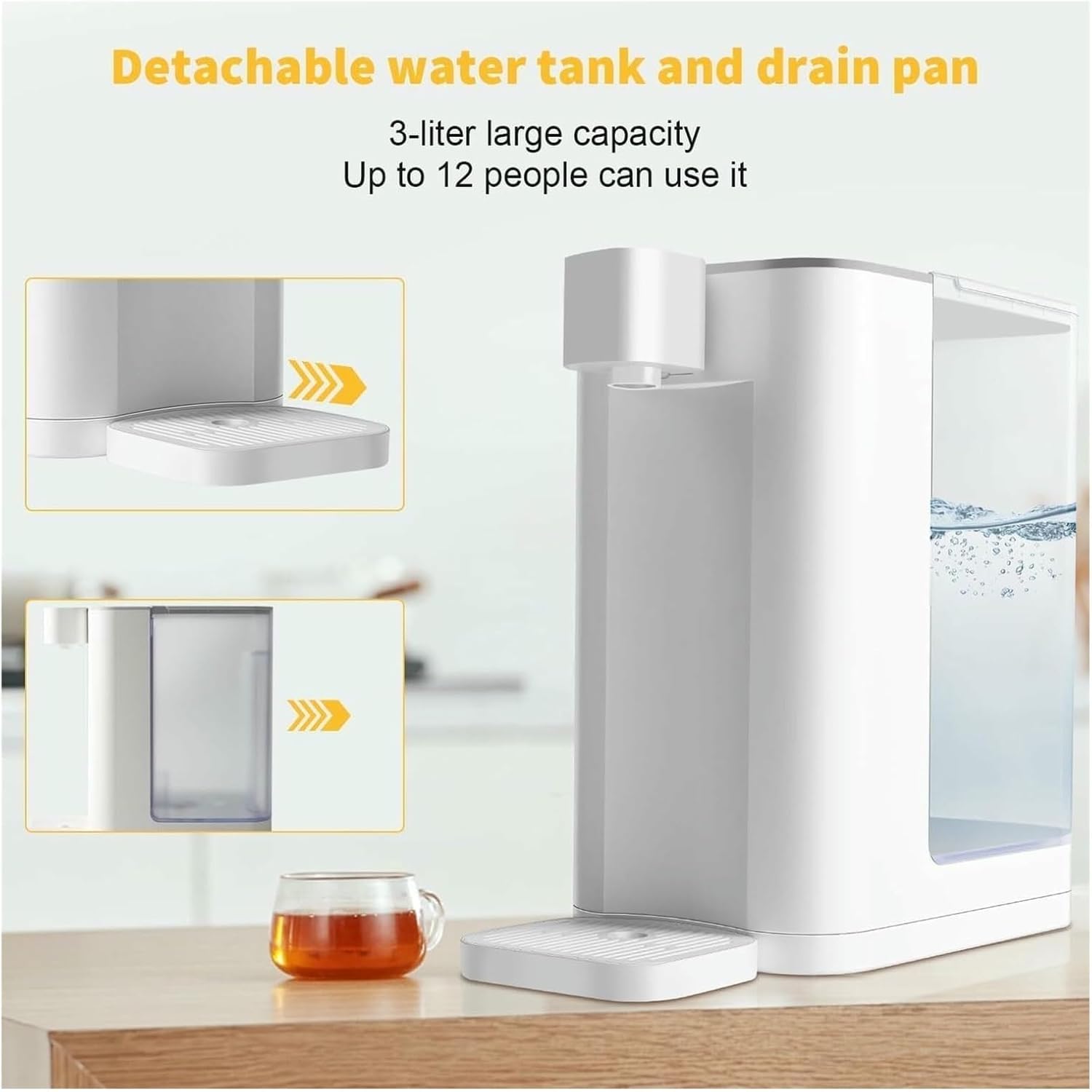 Upgrade your daily routine with the Instant Hot Water Dispenser, designed to deliver speed, convenience, and precision at the touch of a button. Whether you're starting your morning with a perfect cup of coffee or preparing a late-night tea, this appliance is your go-to solution for instant hot water.Key Features & Benefits: 3-Second Instant Hot Water: A powerful 2100W heating system provides near-boiling water in just seconds. No more waiting for a kettle to boil—ideal for your busy lifestyle. 5 Customizable Temperature Settings: Precisely select from room temperature to a full boil (45°C/113°F to 100°C/212°F) to perfectly brew green tea, black coffee, baby formula, or instant soups. Built-in Water Filtration: The included water filter ensures every cup is made from cleaner, better-tasting water. The filter typically lasts for about two months of regular use. Intelligent Safety Features: Built-in dry-boil protection and an automatic shut-off mechanism provide added safety and durability for everyday use. User-Friendly Digital Touchscreen:The sleek touchscreen interface with a soft night light allows for easy operation in any lighting condition, day or night.Compact and Portable:With a modest 3L capacity and a sleek white design, it fits effortlessly on your countertop, in your office, or in a dorm room without taking up excess space.Specifications:Power: 2100WRated voltage: 220V/50HZWater tank capacity: 3L (AS plastic material)Temperature Settings: 5 (Room Temp, 45°C, 55°C, 85°C, Boil)Cup Settings: 2 (160ml / 260ml)<;45dBDimensions: 24.8 x 26 x 14.2 cmIncluded: 1x Hot Water Dispenser, 1x Filter Kit (Filter + Holder)Make this versatile and efficient hot water dispenser your newest kitchen essential and enjoy perfectly heated water whenever you need it.