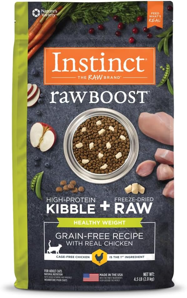 Instinct Raw Boost Grain-Free Indoor Health Rabbit Dry Cat Food starts with real rabbit as the first ingredient, providing high-quality, easily digestible animal protein in every bite. Specially crafted as a dry cat food indoor recipe, it’s designed for indoor cats with fewer calories to suit a less active lifestyle, plus prebiotics to support healthy digestion and stool odor control. This grain free dry cat food is made without grain, potato, corn, wheat, soy, by-product meals, artificial colors, or preservatives—delivering pure, clean nutrition. Each piece of cat kibble is coated in freeze-dried raw and mixed with soft, freeze-dried rabbit bites, combining the taste and benefits of raw cat food with the convenience of kibble. This blend offers bold flavor, enhanced nutrition, and satisfying texture while supporting digestive health and overall wellness. Protein-rich rabbit helps maintain lean muscles, while prebiotics, fiber, antioxidants, and omegas promote digestion, skin, coat, and immune health. Proudly made in the USA with the finest ingredients from around the world, Instinct cat food provides complete, balanced nutrition inspired by the power of raw.