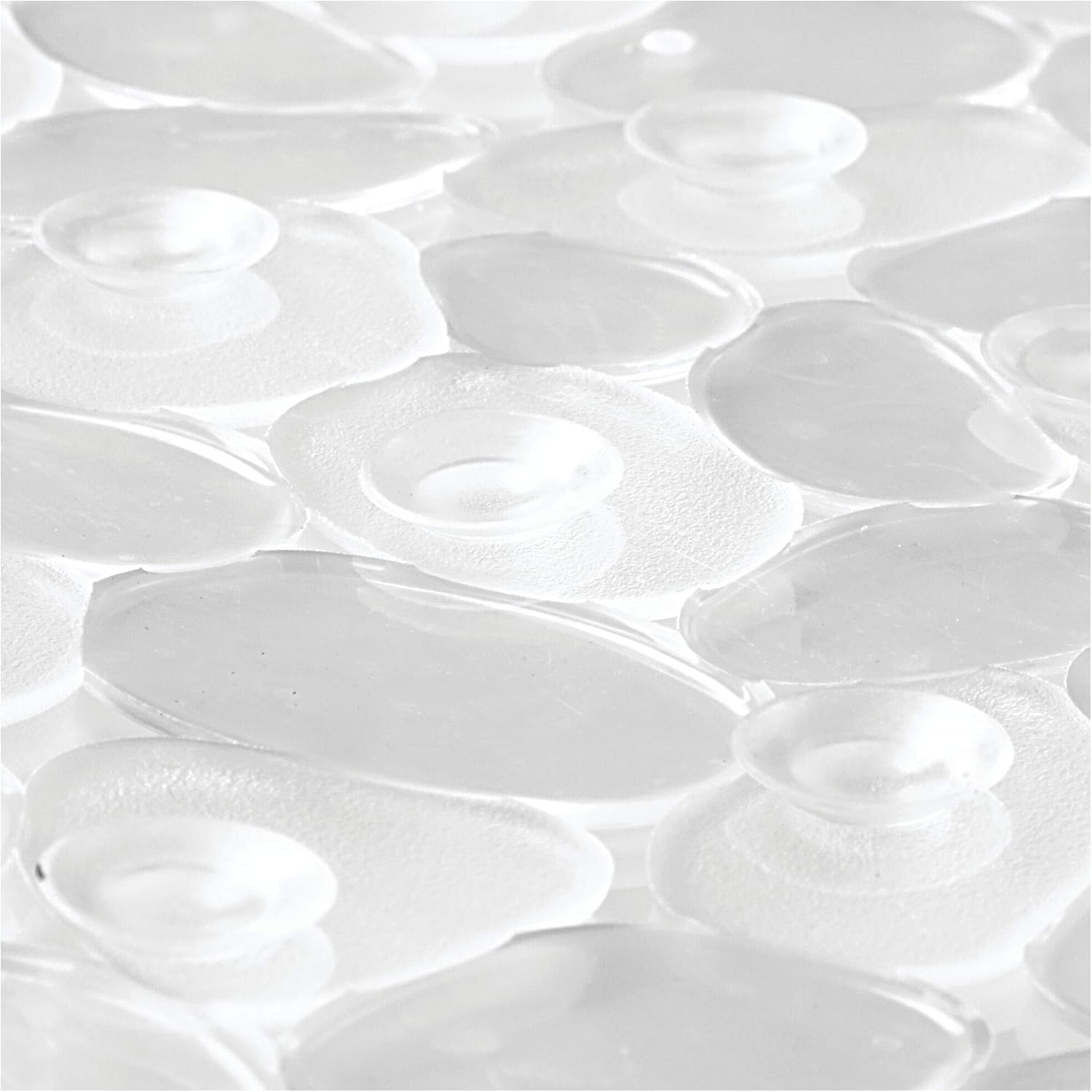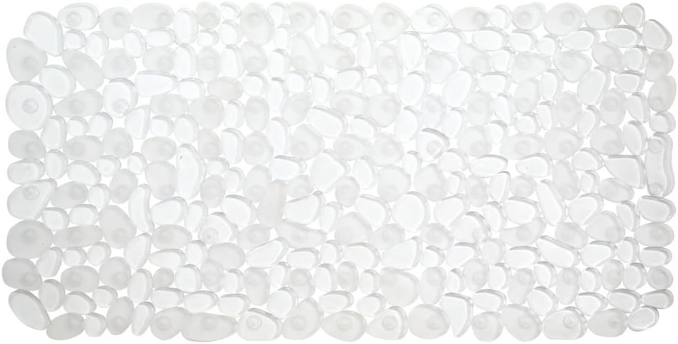 Upgrade your bathroom safety and style with the iDesign Pebble Bath Mat, designed to provide a secure, non slip surface for your tub or shower. This clear bath mat features a modern pebble design and textured surface that adds comfort underfoot while enhancing your bathroom décor. Strong suction cups on the bottom keep the mat firmly in place, helping to prevent slips and falls in wet environments. Measuring 26.5" x 12.75", this rectangular mat is ideal for most standard bathtubs and showers, making it a versatile choice for any home. Crafted from durable rubber and vinyl, it is easy to clean and maintain, ensuring long-lasting use. The clear construction blends seamlessly with any bathroom color scheme, while the solid pattern offers a sleek, minimalist look. Perfect for families, kids, and seniors, this bath tub mat delivers reliable traction and peace of mind during every bath or shower. Manufacturer Number: 80010. Country of Origin: China. Distributed by Interdesign.