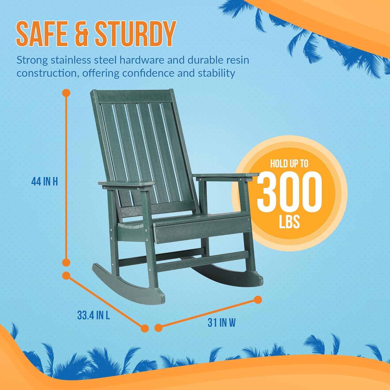 The EZ-Care Tek-Wood Adirondack Rocker is the perfect addition to any outdoor space, combining timeless style with advanced durability. Crafted from high-quality, fade-resistant resin, this adirondack rocking chair outdoor is built to withstand harsh weather conditions, including rain, snow, and intense sunlight. Its weather-proof design ensures long-lasting appeal without fading or cracking, making it an ideal choice for those seeking premium polyresin outdoor furniture. Designed with comfort in mind, this rocking lounge chair features a curved seat and contoured back for superior ergonomic support. The stable rocking base provides smooth, safe motion, ensuring a relaxing experience for any user. This plastic adirondack chair holds up to 300 pounds, making it both stylish and functional for a variety of outdoor settings, including patios, porches, and gardens. Its low-maintenance build means cleaning is effortless with just soap and water. Whether styled as a porch rocker, outside rocking chair, or wood rocking chair outdoor, the Adirondack Rocker seamlessly blends into any aesthetic while offering unmatched resilience. As a standout in the realm of adirondack chairs resin and adirondack rockers, this eco-friendly piece of polywood rocking chairs is a durable, stylish choice for anyone looking to enhance their patio furniture collection with high-performance patio rocking chairs. Backed by a 1-year limited warranty. Dimensions: 33.4-in L x 31-in W x 44-in H. Weight: 41.9-lbs.
