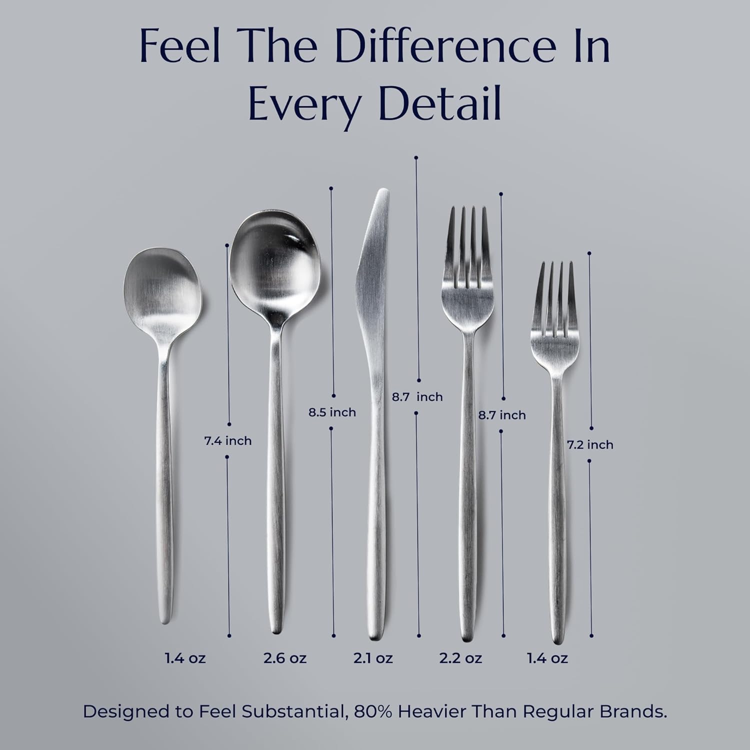 Included Components 4 x Dessert Spoon – 7.4 inches/ 18.8 cm, 1.4 oz/ 40 g, 4 x Dinner Fork – 8.7 inches/ 22.0 cm, 2.2 oz/ 62 g, 4 x Dinner Knife – 8.7 inches/ 22.0 cm, 2.1 oz/ 60 g, 4 x Dinner Spoon – 8.5 inches/ 21.5 cm, 2.6 oz/ 74 g, 4 x Salad Fork – 7.2 inches/ 18.4 cm, 1.4 oz/ 40 g