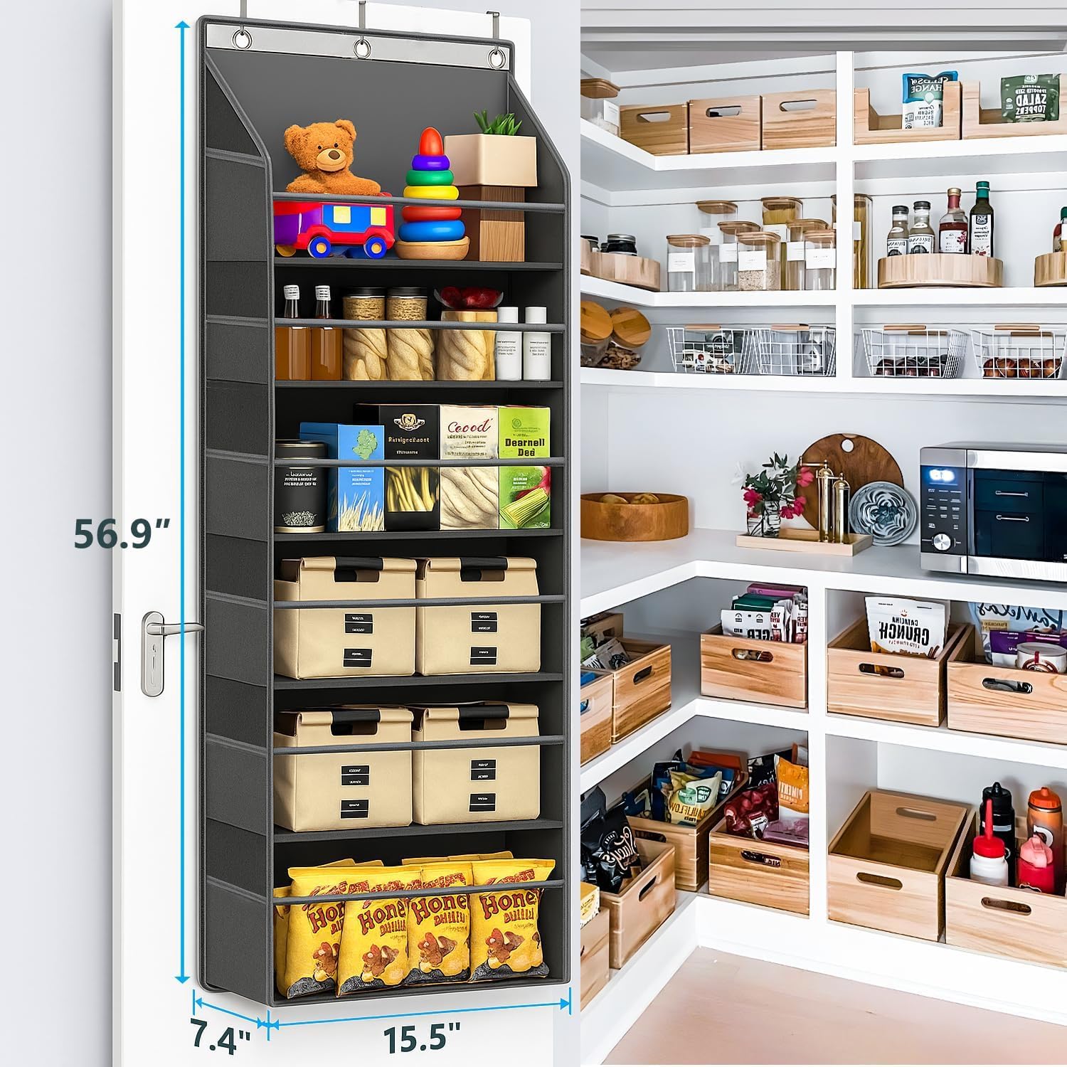 JHD over the door pantry organizer is an upgraded 6-tier hanging rack featuring 12 mesh side pockets and three reinforced hooks that support up to 50lbs. over the door storage organizer size 15.5" L x 7.4" W x 56.9" H, it maximizes storage in tight spaces while keeping your belongings organized.Made from premium, durable non-woven fabric, it maintains its shape under heavy use, and the clear PVC windows let you easily see inside each pocket.Perfect for bedrooms, bathrooms, nurseries, or pantries, this versatile organizer offers a neat and efficient solution for any home.