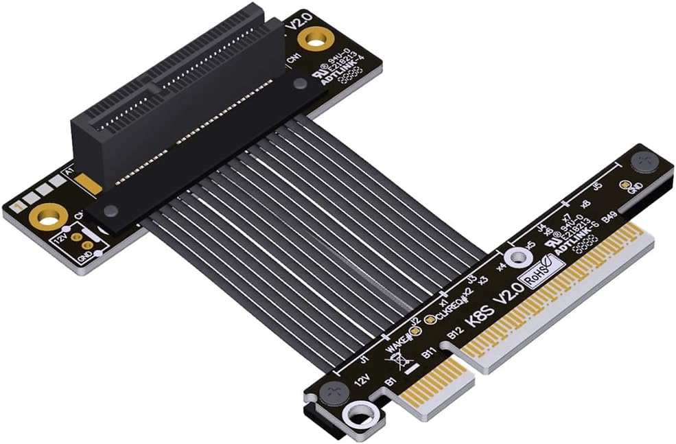 JMT ADT-K82S PCIE5.0 x4 to x8 Extension Adapter Gen5 128Gbps High Speed Support Network Card, Hard Drive, USB Card Product Detail: Product Model: K82 Series Product Name: PCIe 5.0 x4 to x8 Adapter Extension Cable Cable Length: 15cm, Custom lengths supported. Speed Bandwidth: PCIe 5.0 x4 Gen5, 128Gbps Compatible Cards: Network cards, capture cards, USB cards,SSD cards. Supported if the PCIe card is x4 and the motherboard slot is x8. Cable Length Specification:Cable length refers only to the wire section, excluding PCB and connectors. Lengths may vary slightly. The cable is a fifth-generation PCIe-specific black slim profile with a thickness of 0.8mm. It is highly flexible and bendable without affecting functionality, but should not be pulled. Product Model Description: K82SF-BK: PCIe 5.0 x4 to x8 Extension Cable, Standard Version,Open Female Header 180° Panel Mount Straight Type, Slim Cable. K82SL-BK: PCIe 5.0 x4 to x8 Extension Cable, Standard Version,Open Female Header 90° Upward Angle Type, Slim Cable. K82SR-BK: PCIe 5.0 x4 to x8 Extension Cable, Standard Version,Open Female Header 270° Downward Angle Type, Slim Cable. Important Notes: 1. Always verify the correct orientation when plugging in. Avoid reverse or misaligned insertion to prevent device damage. When connecting, first secure the device's socket before inserting the cable to prevent excessive force that could break socket pins. Do not bend or pull the cable within 2cm of the solder joints at either end. 2. Signal transmission capabilities vary across different motherboards and devices.Signal degradation occurs whenever an extension cable is used.