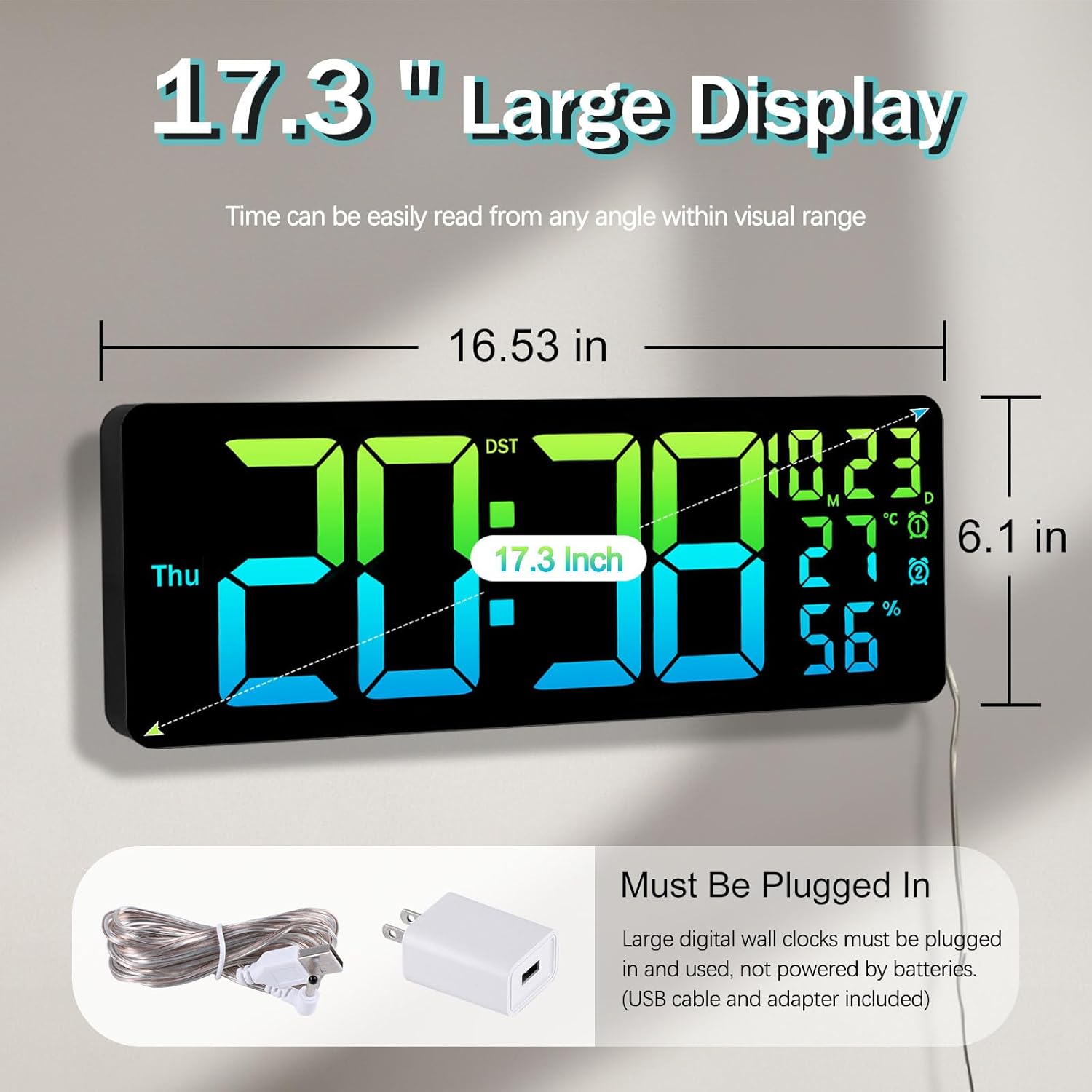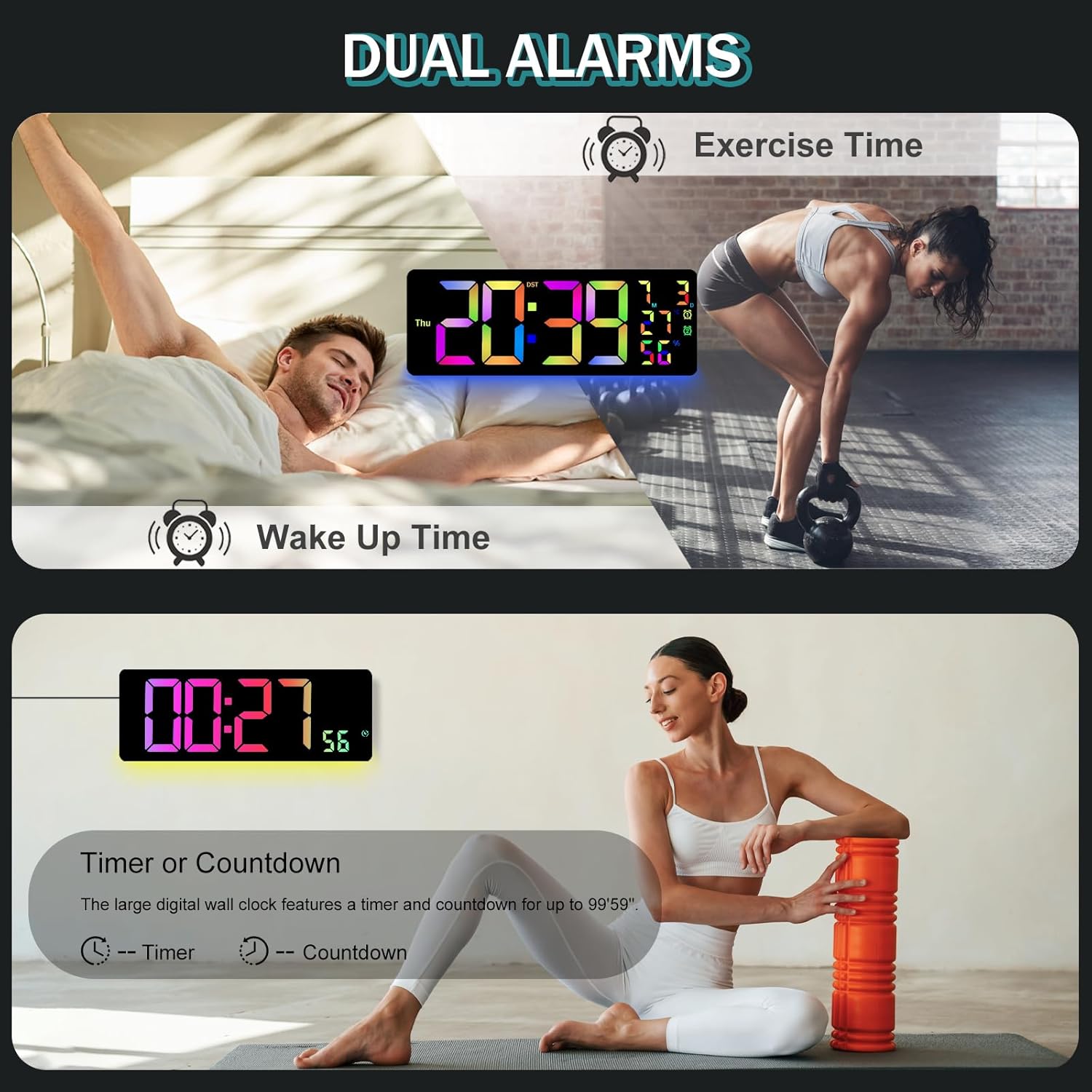 | Additional Features | Large Display, Adjustable Brightness, Temperature Display, 2 Alarm Clock/Timer, Calendar Display |