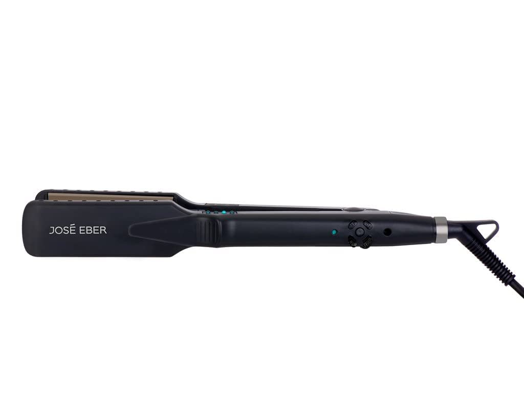JOSE EBER: FLAT IRON: WET OR DRY - Innovative Technology that locks in moisture as it straightens, the Jose Eber Wet or Dry Styling Iron leaves hair softer, silkier and smoother than ever before. With specialized plates, it works equally well on damp or dry hair. It locks in nutrients and keeps hair hydrated within the cuticle with every pass, helping to strengthen and improves hairs elasticity. Eliminate the need for additional drying and damaging heat from a blow dryer. With variable temperature control, you decide how much heat you want depending upon your hair type, putting the control in your hands. Designed with wider plates, the Wet or Dry allows you to cover more hair with each pass making styling quicker and more efficient, even for thicker, coarser hair. HOW TO USE: Before using, wash hair and towel-dry. Apply a heat protector or styling aide. Divide your hair into small 1- 1½“ sections and run the iron slowly from roots to tips. The iron may make a hissing which is normal; this is the water evaporating from your damp hair. With all straightening irons we recommend running a comb trough hair before you slide the straightener and make sure to keep dry sections separate from damp sections which may cause frizz. KEY FEATURES: Extra wide 1.5" plates, Steam venting, ideal for all hair types, automatic shutdown after 60 minutes.