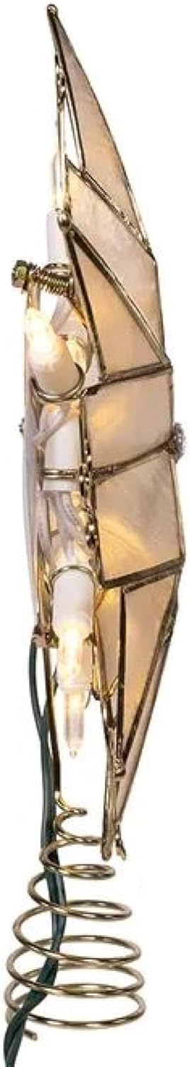 Kurt Adler's 10 Light LED Capiz Star + Scroll Treetop is a beautiful and elegant addition to your Christmas tree. This treetop features a classic eight-point star crafted from luminous white capiz framed in gold, enhanced with intricate gold scroll accents and a central gem for added sparkle. Illuminated by 10 warm LED lights, it emits a soft, festive glow that brings warmth to your holiday décor. The sturdy coil base ensures easy and secure placement on your tree. Perfect for both traditional and contemporary styles, this treetop adds a timeless and sophisticated touch to your seasonal decorations.